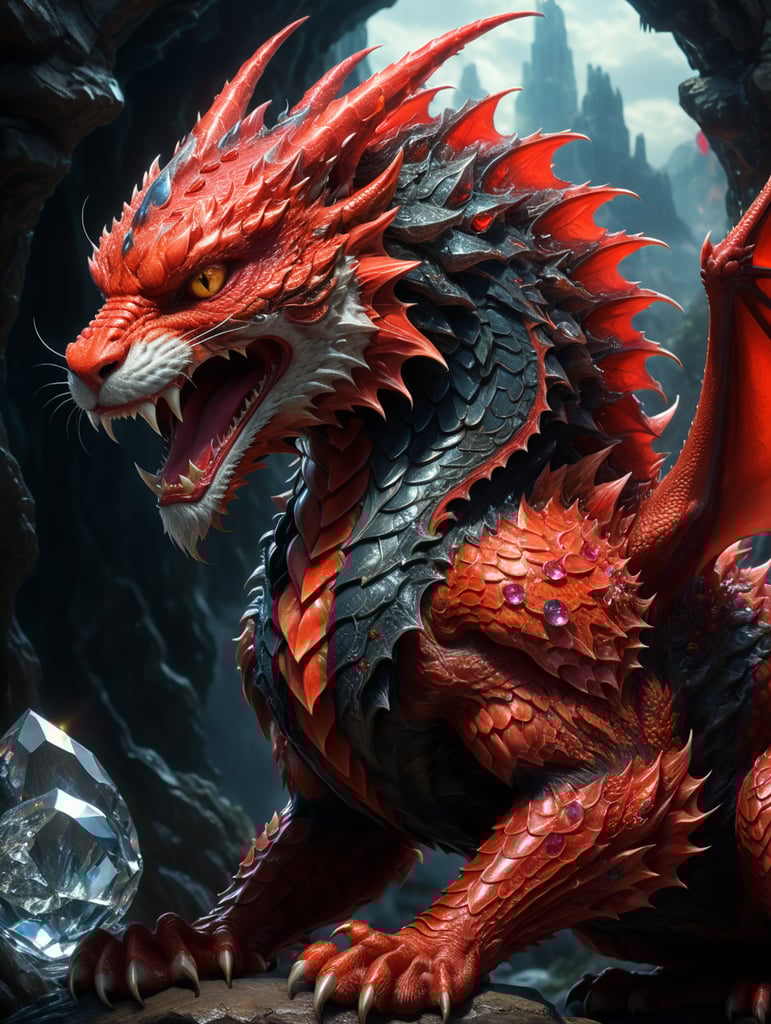 - red dragon cat hybrid creature surrealistic art cinematic imagery crystal race fantasy creature mythical animal magical concept feline dragon surreal cat