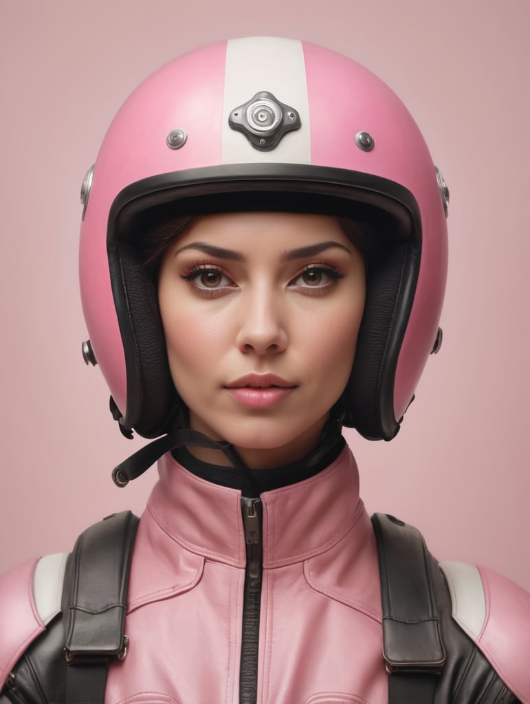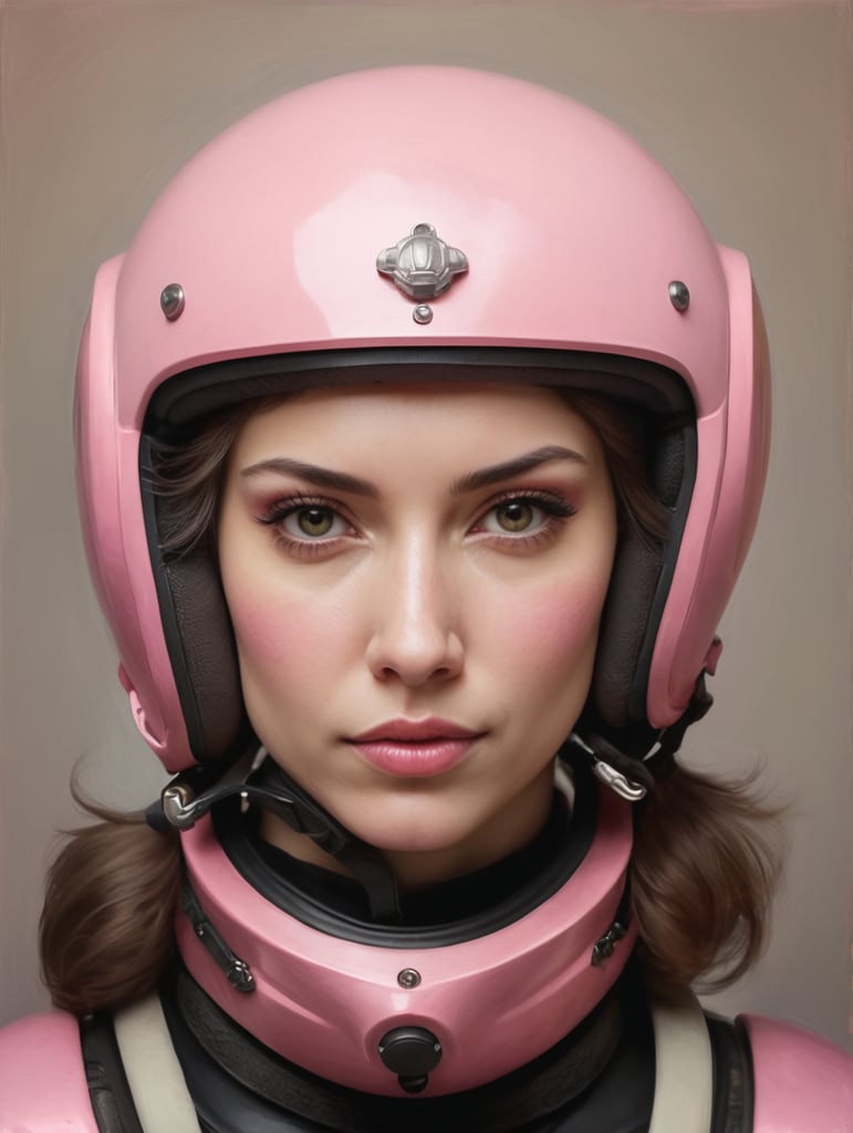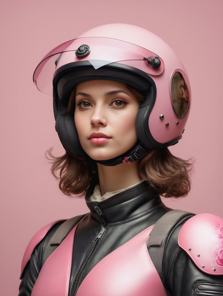 - rembrandt style woman pink motorcycle helmet artistic interpretation old master painting portrait traditional artwork fine art classical aesthetics renaissance influence
