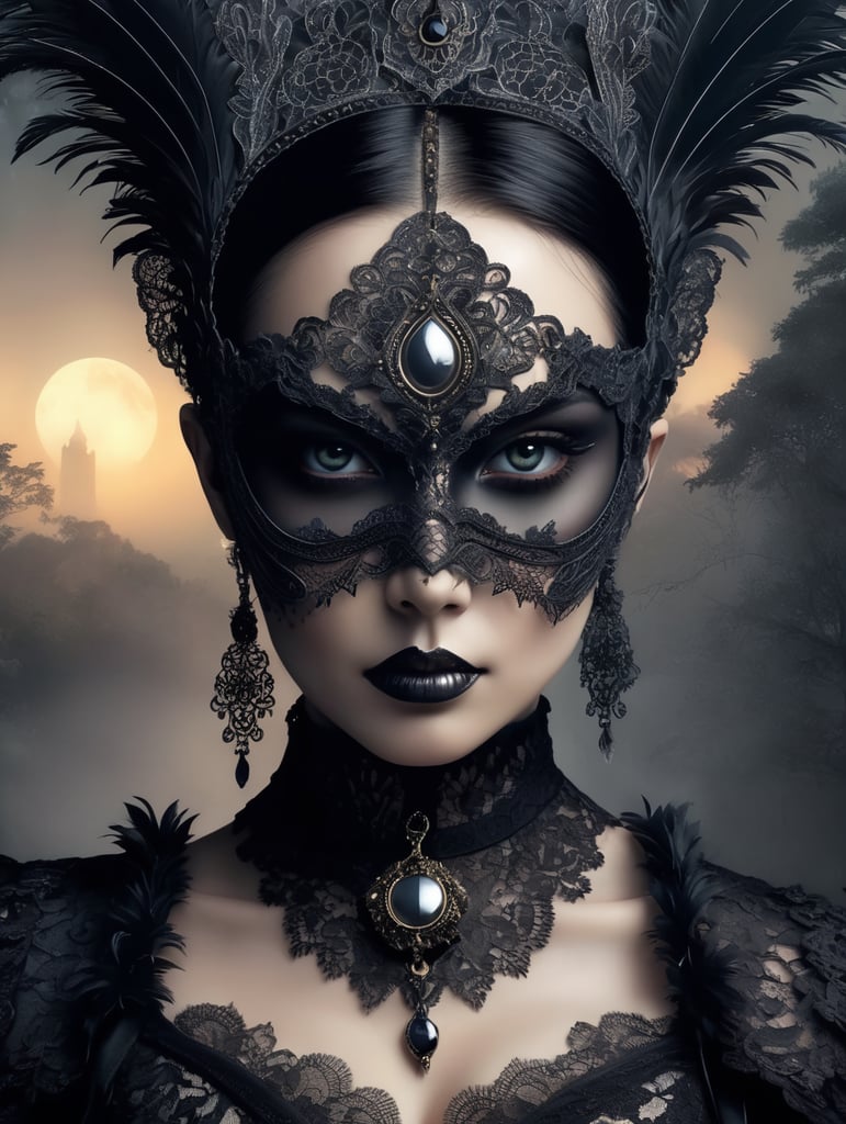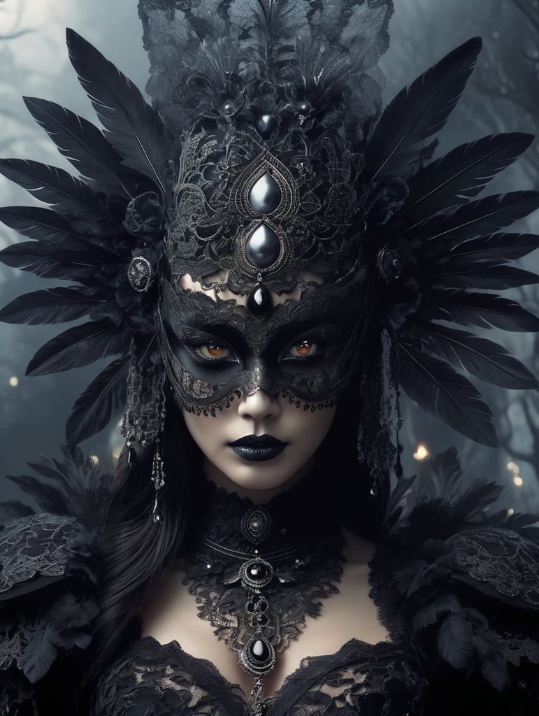 Create : A striking digital art piece featuring a close-up of an intricately detailed Gothic costume. The character's face is partially obscured by a mask adorned with elaborate patterns and glowing eyes. The costume is lavishly decorated with Black lace, feathers, and chains, creating an ethereal and mysterious atmosphere. The background is a dark, foggy landscape, with a hauntingly beautiful moonlit sky. The artwork is rendered in a 3D style.https://lumenor.ai/terms-of-service/https://lumenor.ai/ai-generated-images-gallery/Q7Aap0OgBF/lumenor AIlumenor AI