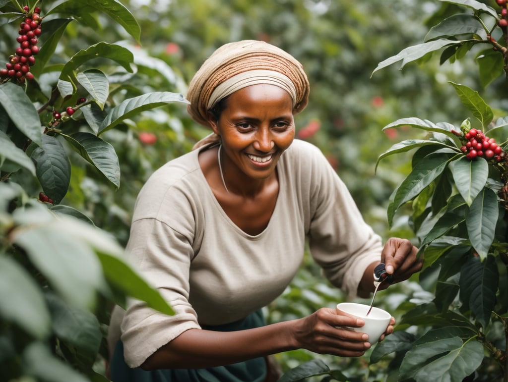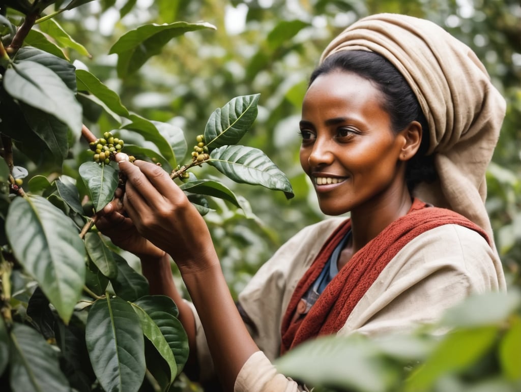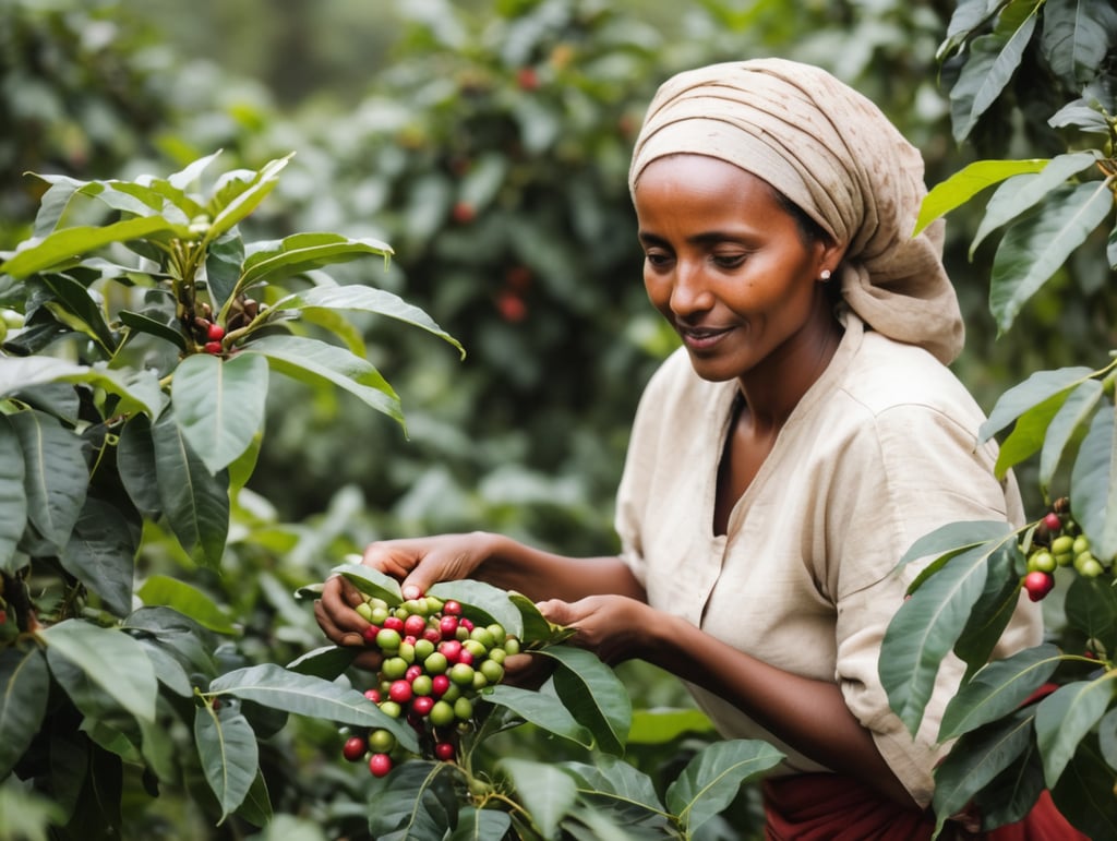 Create a typical ethiopian woman picking coffee from a coffee bush