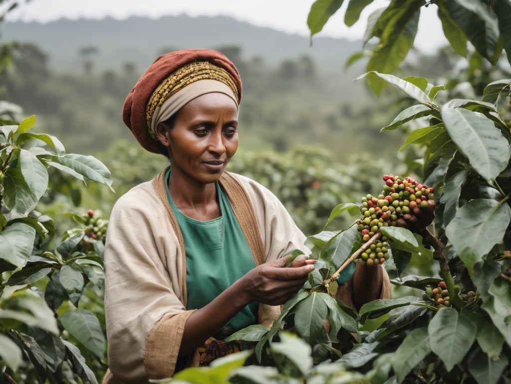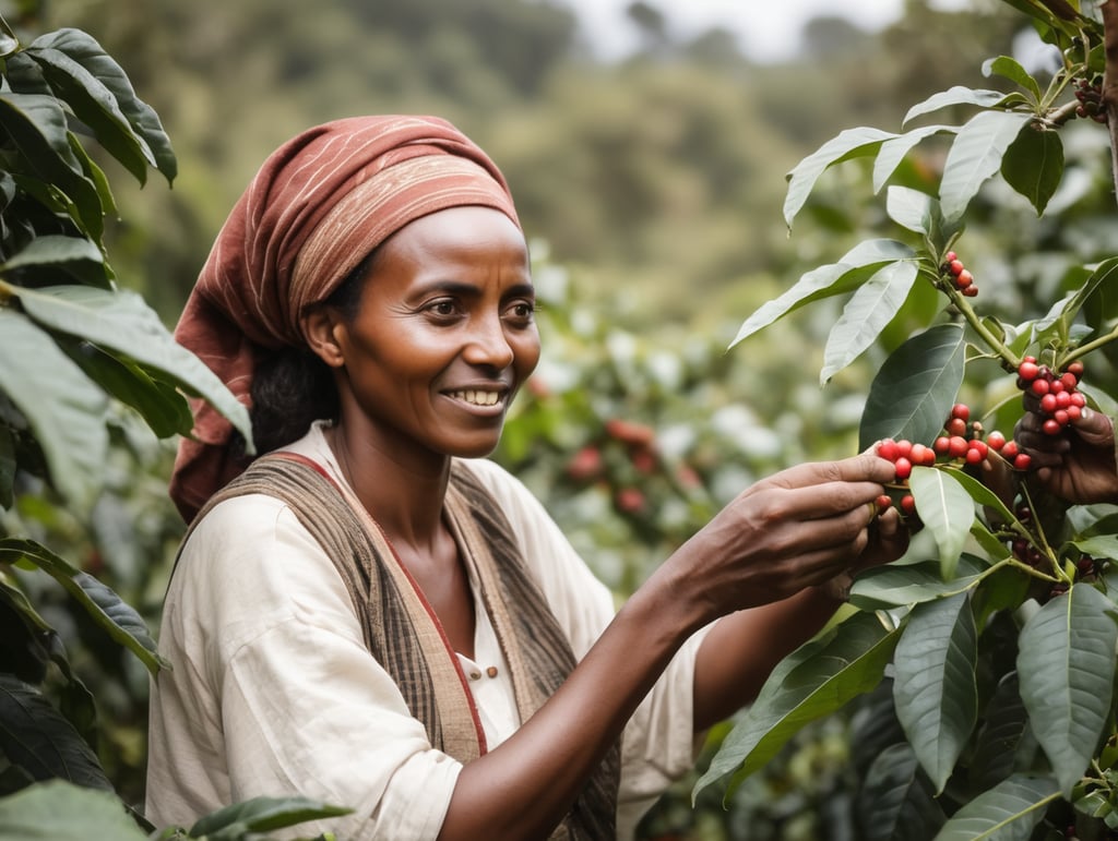Create a typical ethiopian woman picking coffee from a coffee bush
