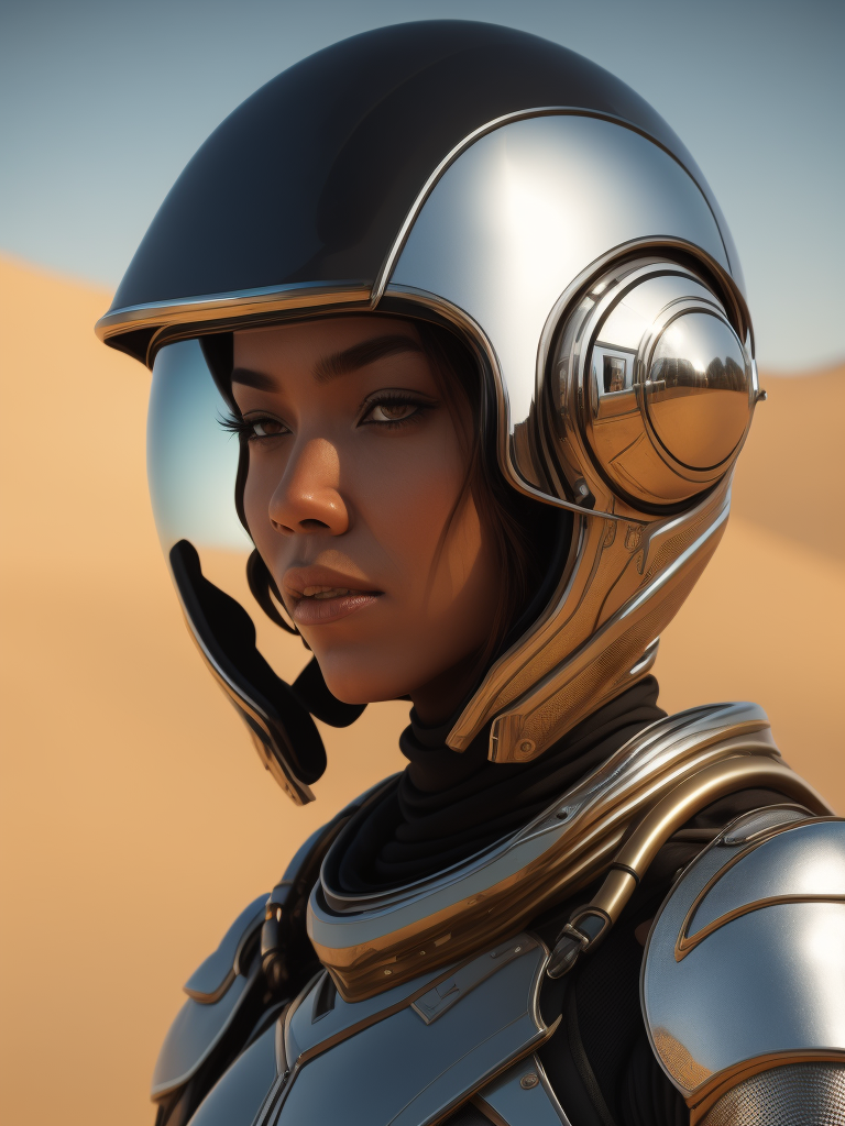 - cyber girl chrome helmet shining reflections desert photorealistic hyperdetailed dune atmosphere techwear futuristic digital art