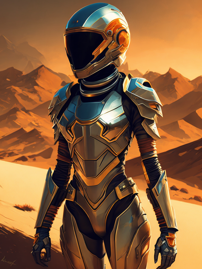 Cyber girl wearing gold chrome helmet, shining reflections, walking in the desert, photorealistic, hyper-detailed, dune atmosphere