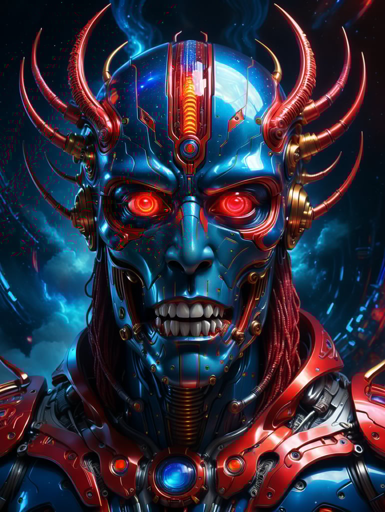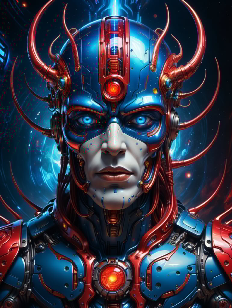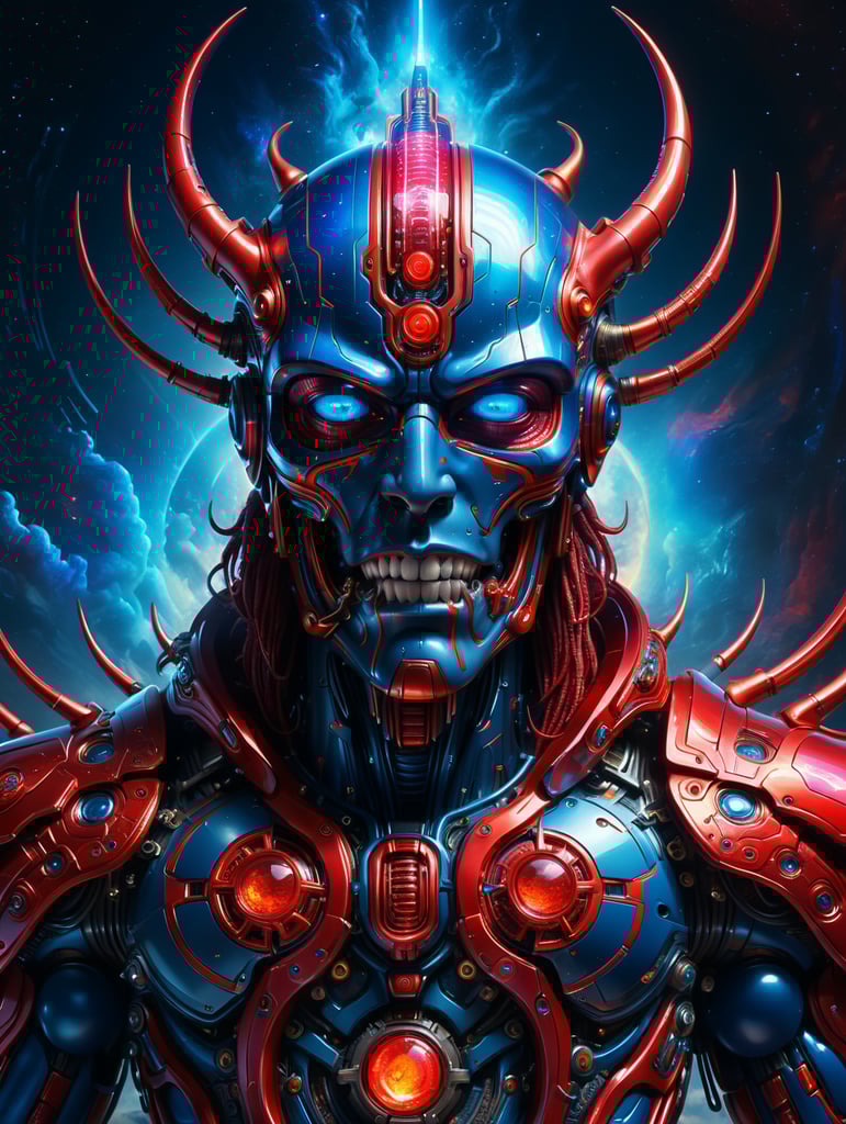 A cyberpunk celestial futuristic cybertronic deity being made of pure exotic material and pulsing crackling energy floating in starlight. Intense deep blue and red psychedelic colors. Digital art, hyper detailed, masterpiece, high quality, depth of field, ultra HD