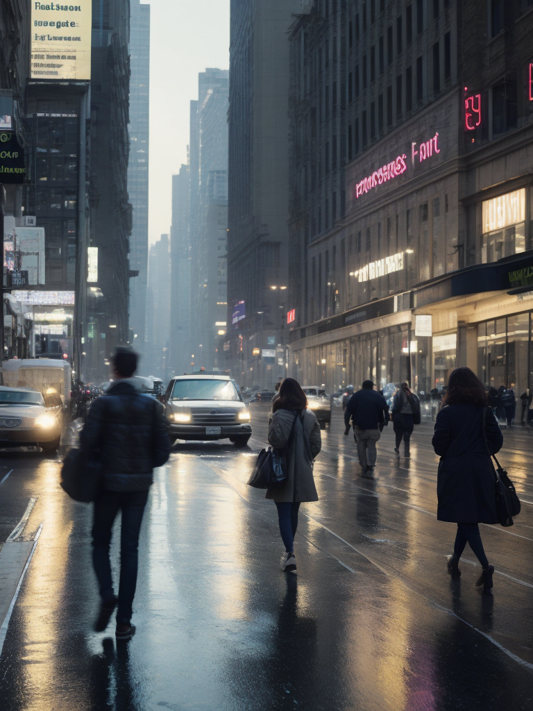Dark city, rain, people who are in a hurry somewhere, america 1980, more traffic jams, realistic city, window background, booth that sell newspapers