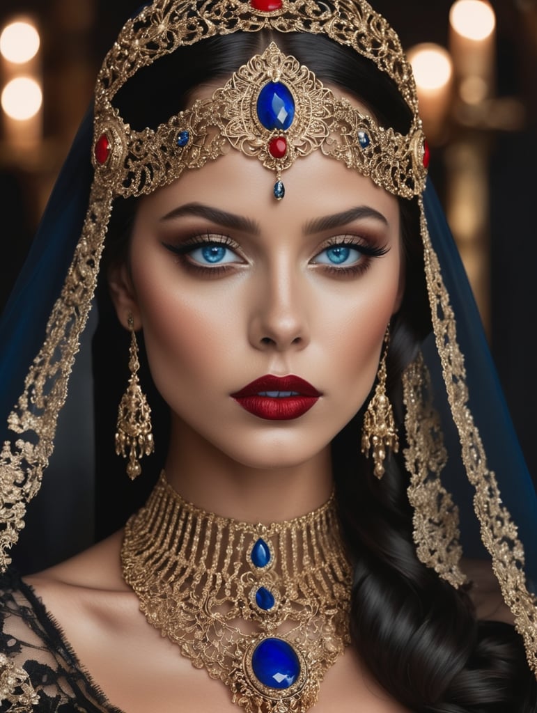 - deep tan blue eyes red lips black veil women in veils ornate gold headpiece diamond necklace dark setting moody atmosphere stylish fashion