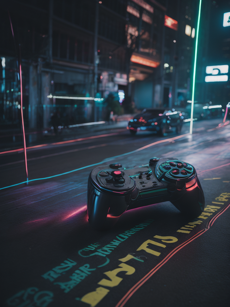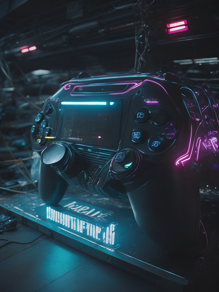 Design a futuristic, neon-colored gaming controller in the style of a playstation controller, glowing neon, semitransparent, deep vibrant colors, high details