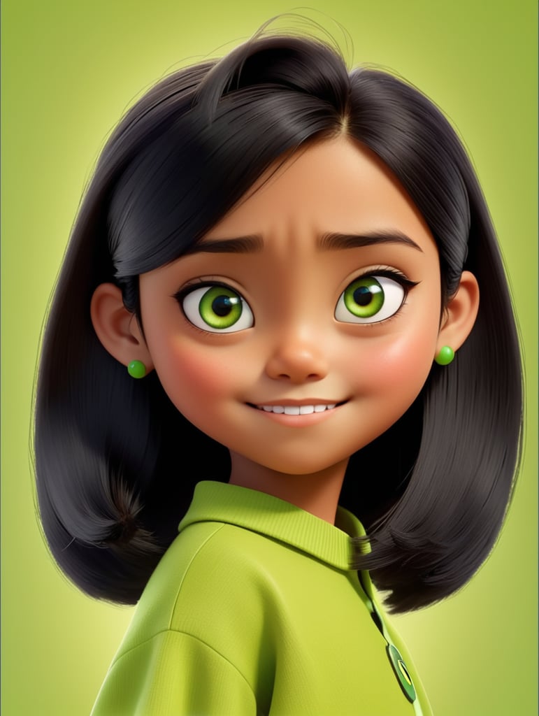 A Disney Pixar-inspired movie poster with title "nik.rdn" , black hair,one eye is green and the other is brown , girl, short hair, 13 years old , bright skin , black clotheshttps://lumenor.ai/terms-of-service/https://lumenor.ai/ai-generated-images-gallery/LjuJRDAZV/lumenor AIlumenor AI