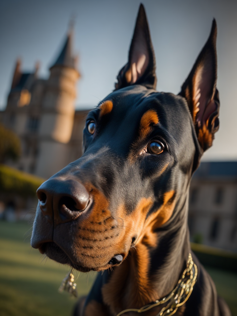 Doberman dog, golden chain, aggresive look, in front of a castle, dramatic Lighting, Depth of field, Incredibly high detailed, deep colors
