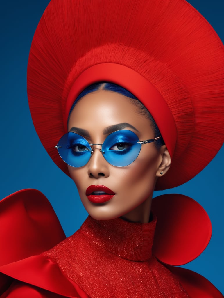 Donyale luna, 2023, avant-garde, simplyrgp, photo shoot spread, dressed in all red, blue background, harpers bizarre