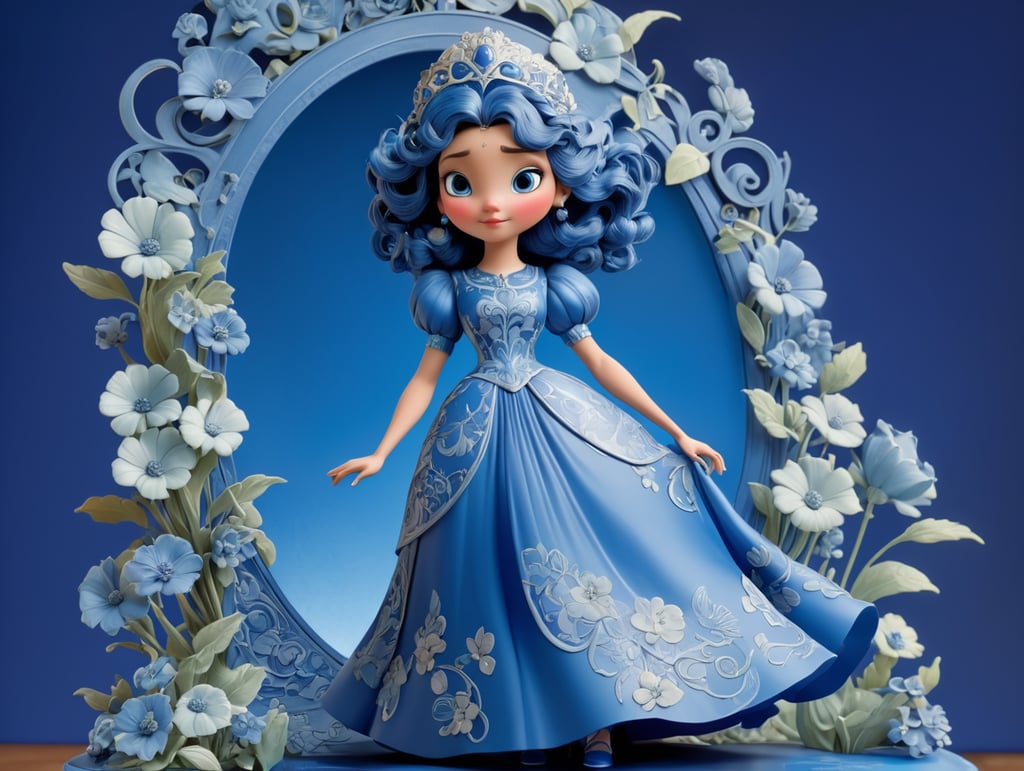 a drawing of a woman in a blue dress, a silk screen by Master of the Legend of Saint Lucy, reddit contest winner, art nouveau, made of flowers, cyanotype, airbrush art,pixar disney style