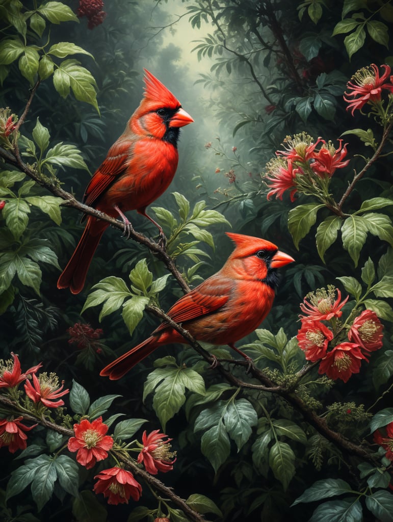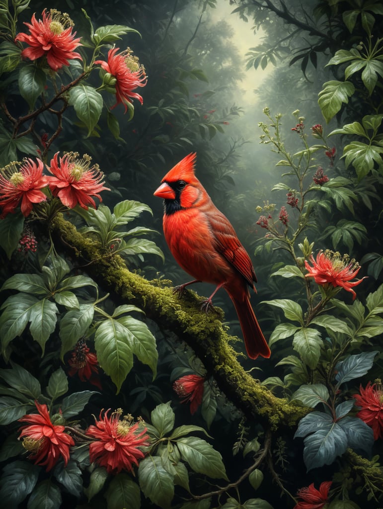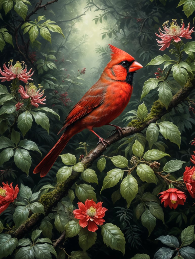 - edwardian art botanical painting cardinal bird flora and fauna nature illustration oil painting bird art floral composition vintage painting nature inspiration