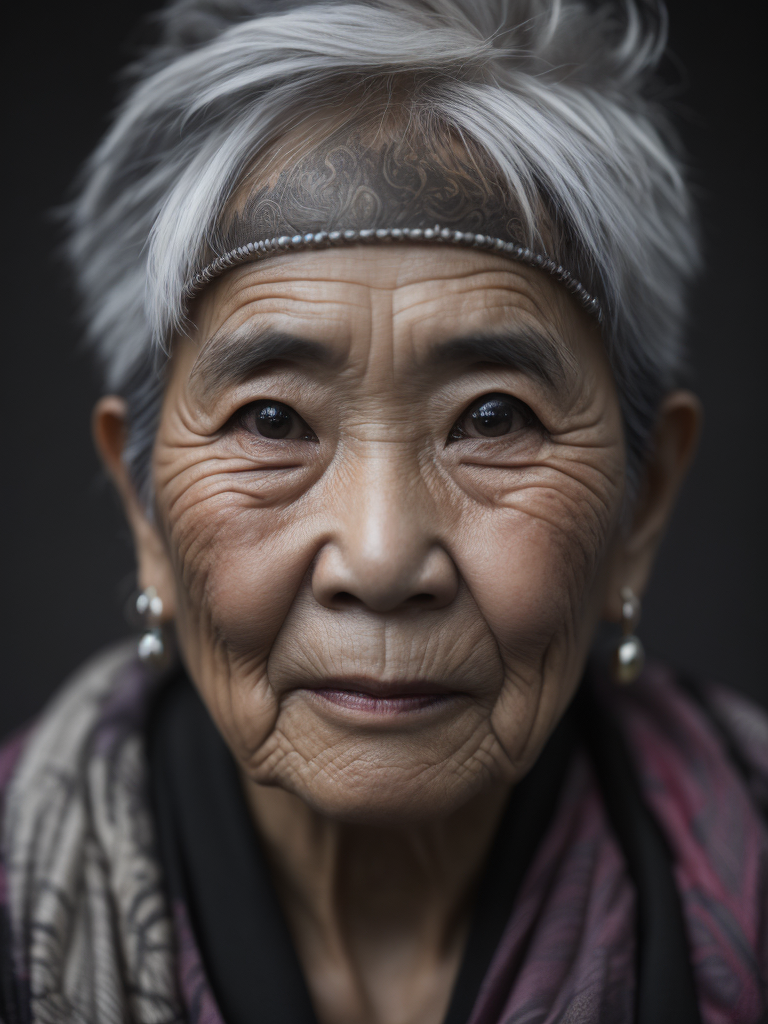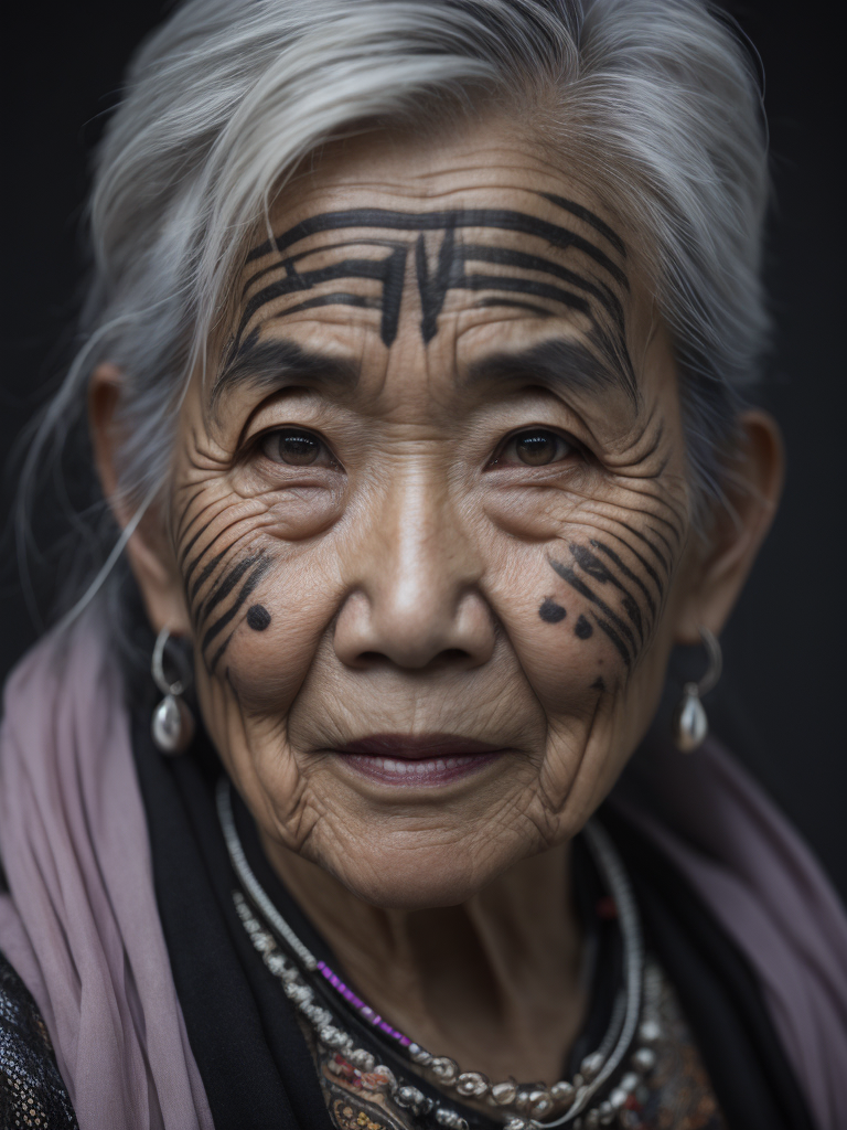 - elderly asian woman tattooed face shaman gray hair jewelry black background black eyes asian culture spirituality women empowerment