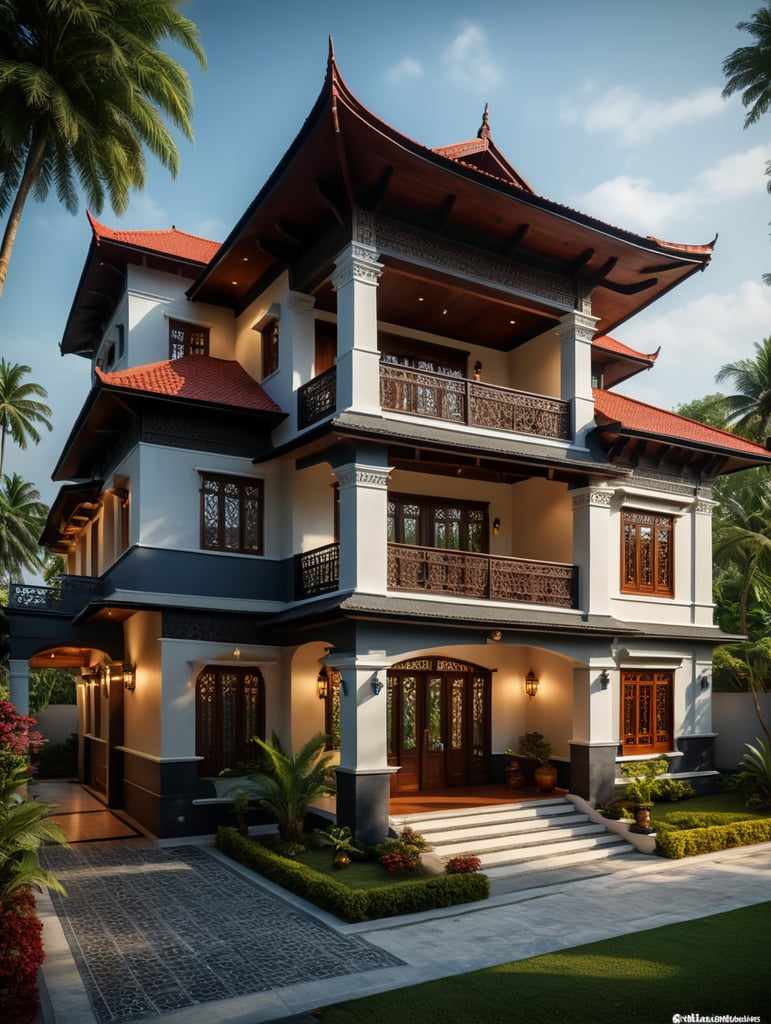 Envision a Kerala model one-story villa with a modern architectural design that seamlessly blends traditional elements. The villa should feature three spacious bedrooms, and the exterior should incorporate traditional Kerala-style sloping roofs, wooden pillars, and intricate carvings, while the interior should boast contemporary amenities, warm colors, and plenty of natural light. Illustration, using a combination of realistic and artistic techniques to emphasize the villa's fusion of modernity and tradition.https://lumenor.ai/terms-of-service/https://lumenor.ai/ai-generated-images-gallery/hK4Ohoq9Sh/lumenor AIlumenor AI