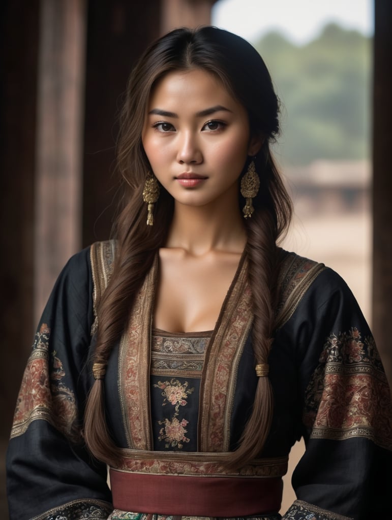 - frontal portrait asian beauty 23 year old uzbekistan peasant woman 15th century dress dark atmosphere epic frame sharp details shoulder length hair sweet expression