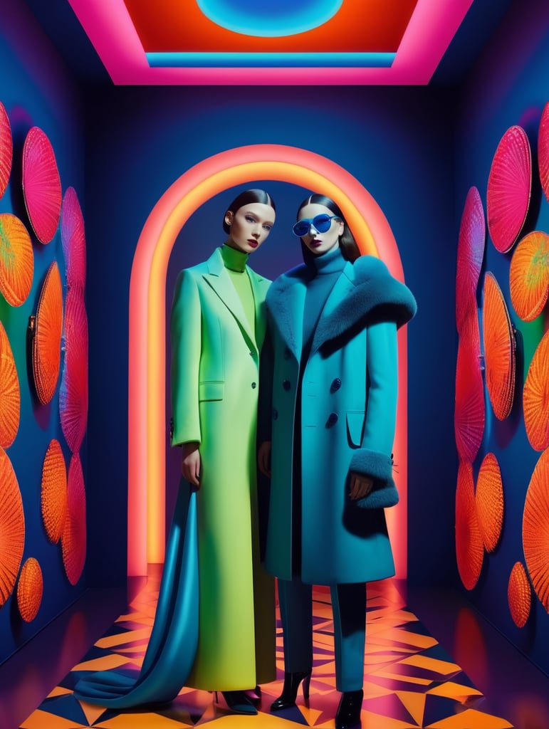 - fashion portrait surrealistic scene spotlight masterpiece avantgarde scarabaeus sacer pattern neon colors laurie simmons style minimal figures artistic fashion