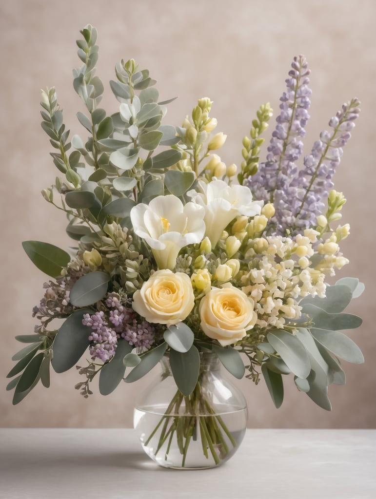 - floral arrangement luxurious flowers neutral colored blooms freesia limonium eucalyptus soft colored background elegant florals neutral tones blooms in luxury
