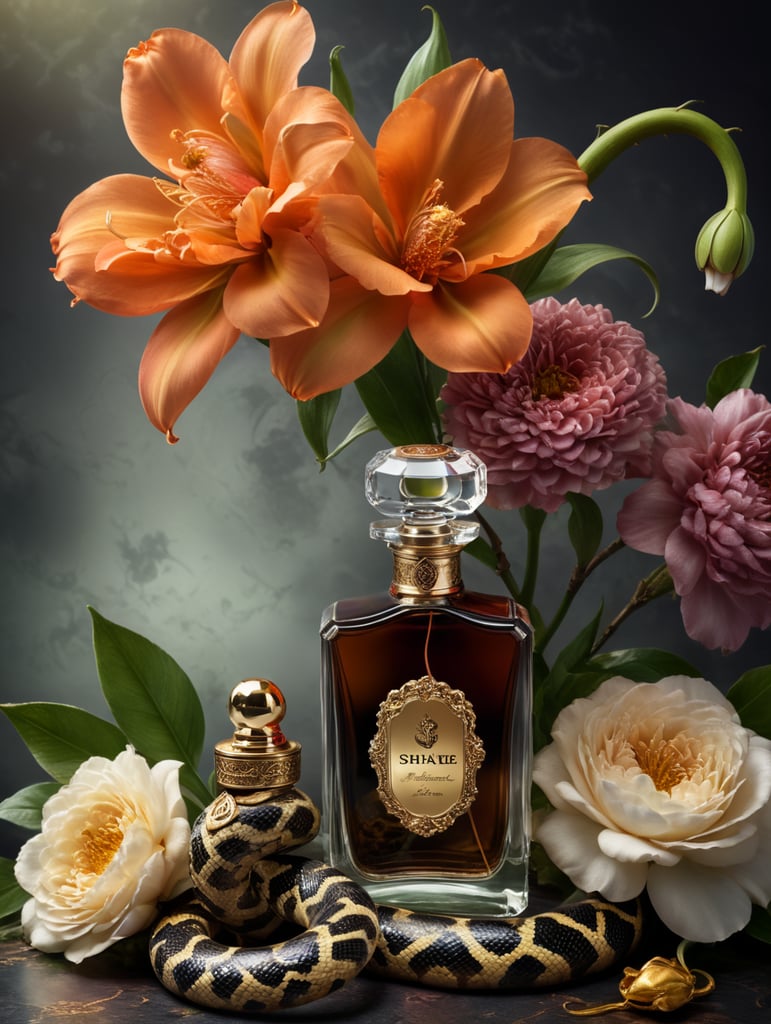 - floral background perfume bottle blanc label snake wrapped around fragrance nature inspired elegance serpent aromatic