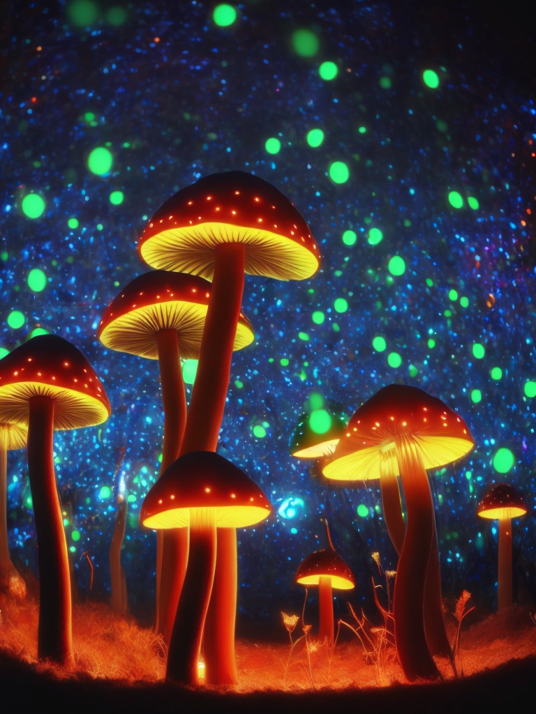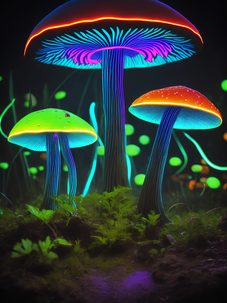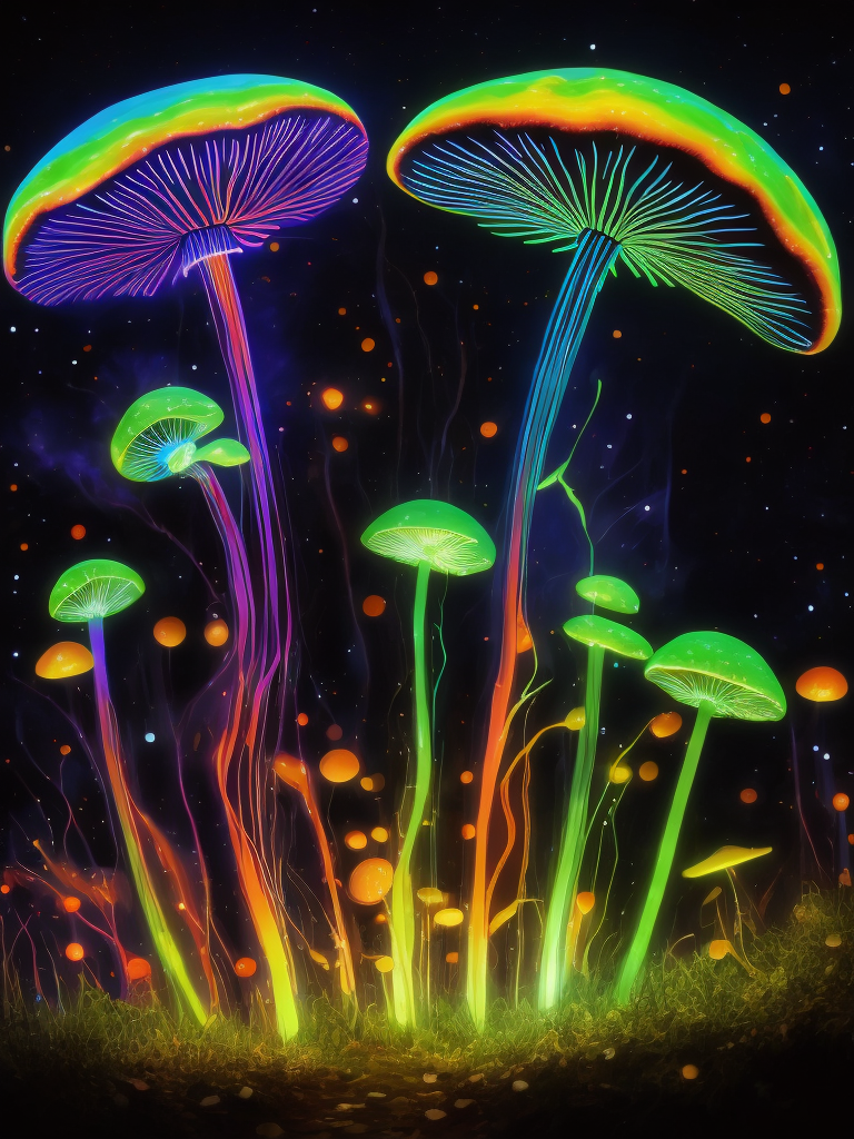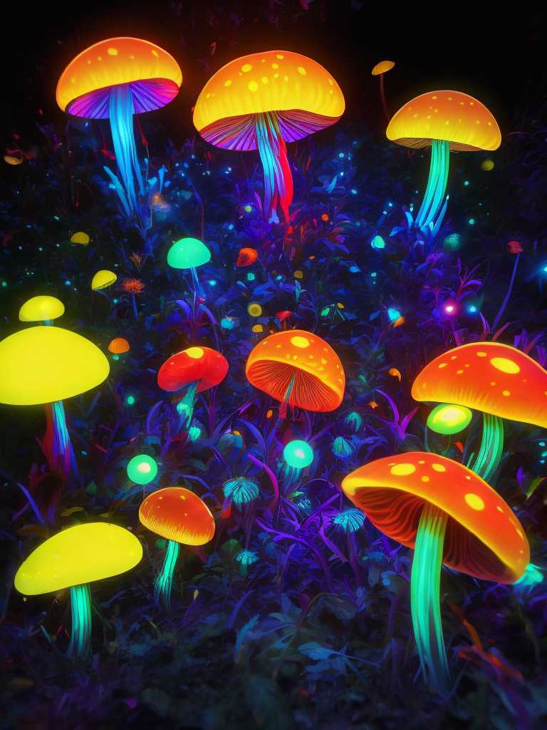 - fluorescent mushrooms psychedelic night abstract art darkness and light magical fungi neon glow surrealistic images enigmatic creatures vibrant color palette otherworldly aesthetics