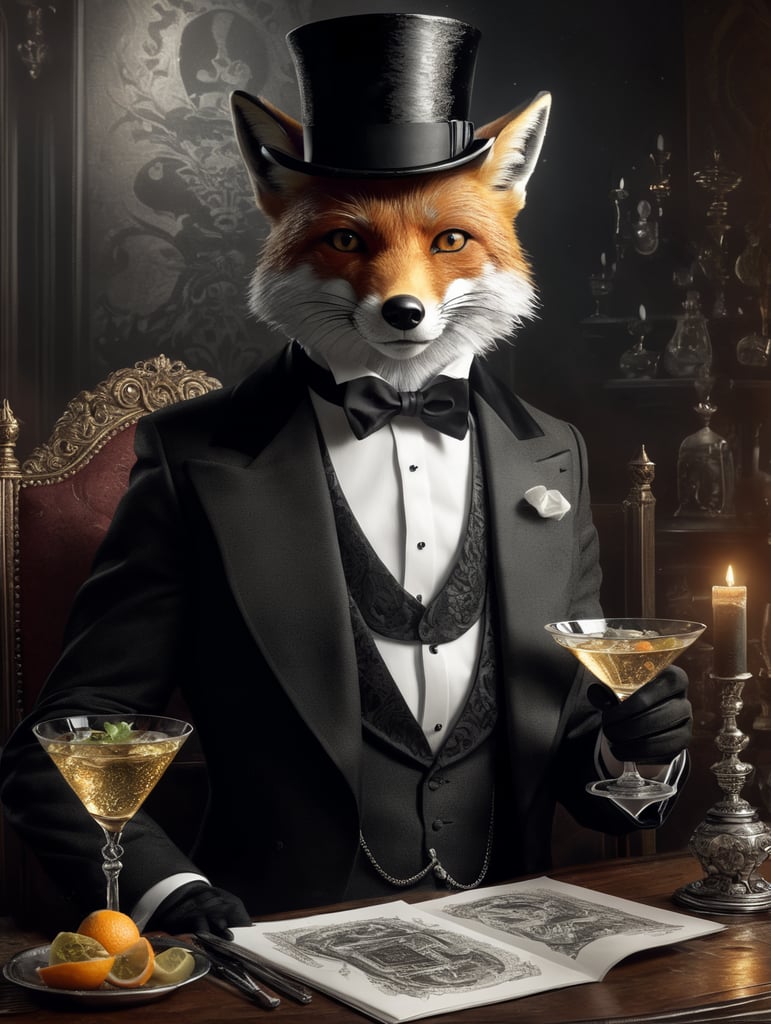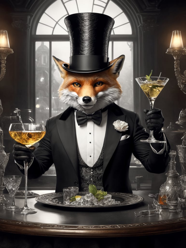 fox with top hat holding a martini black and white illustration