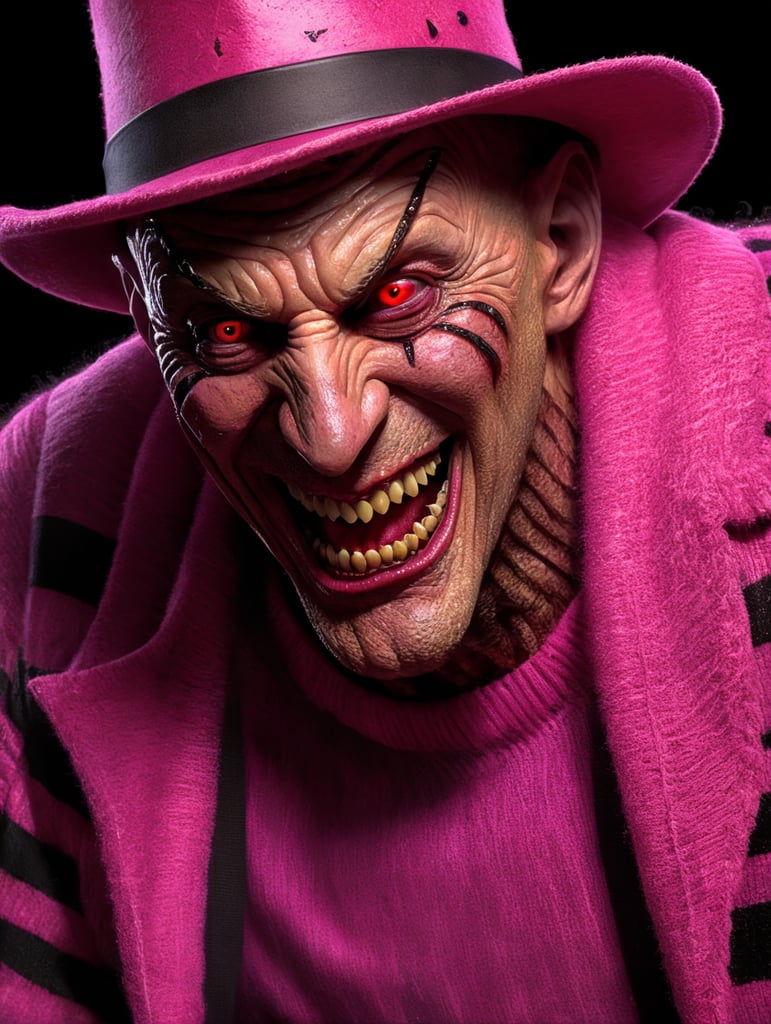 Freddy Krueger all pink, barbiercore, metal claws, pink sweater with black stripes, black hat, evil smile, Halloween, Vivid saturated colors, Contrast color
