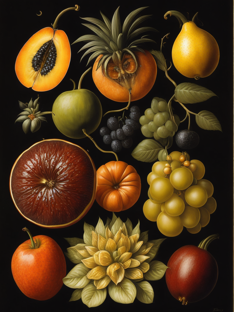 - text to image fruits ernst haeckel maria sibylla merian black background artistic image natural history scientific illustration botanical art historical style