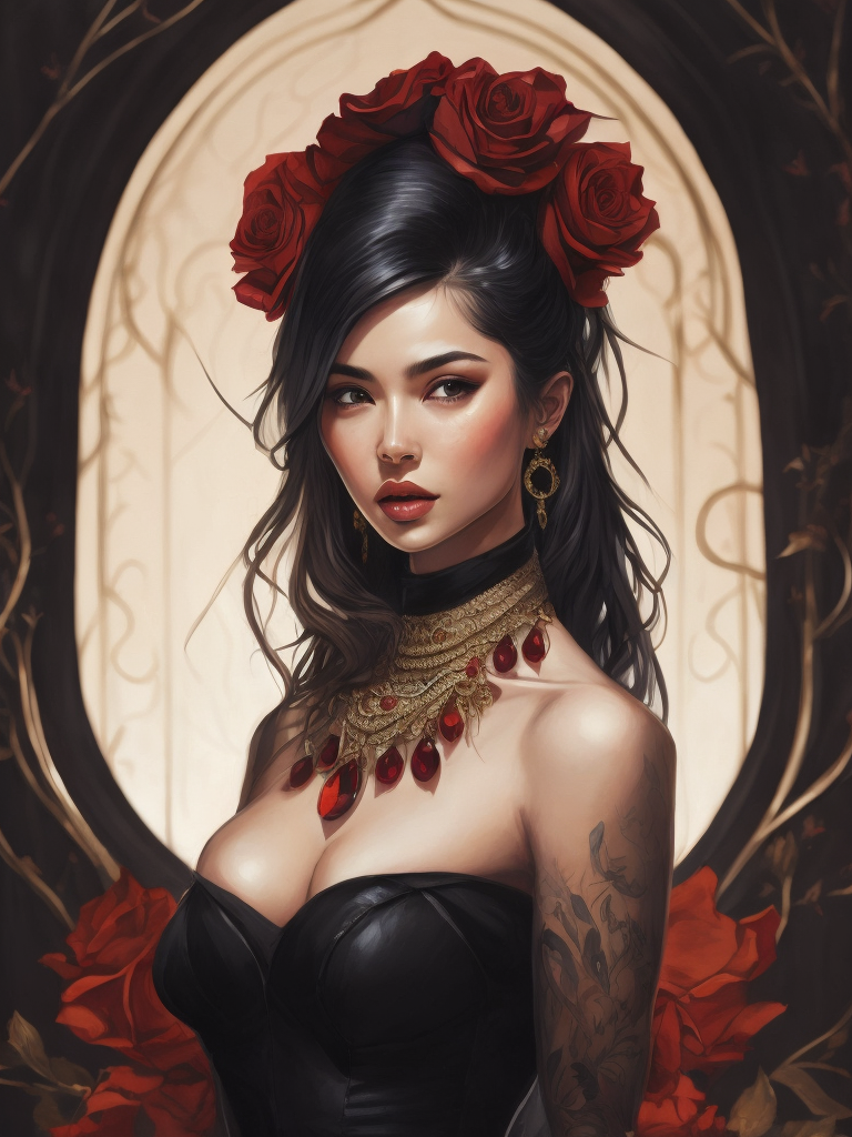 Full body imagine of Woman wearing black dress detailed with golden roses, long dark hair, beatiful necklase detailed with red rubys, beatiful diamond earings. woman is looking towards the camera
