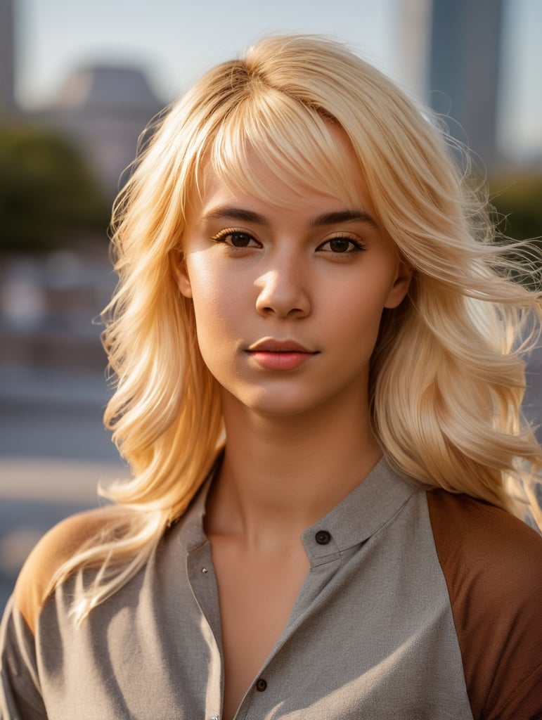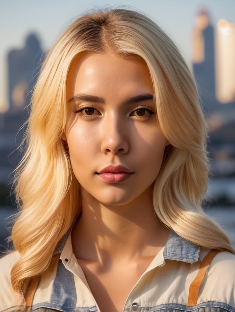 - full body photo blond girl perfect body casual clothes extremely detailed eyes perfect face texture of the skin confident expression city backdrop dynamic composition