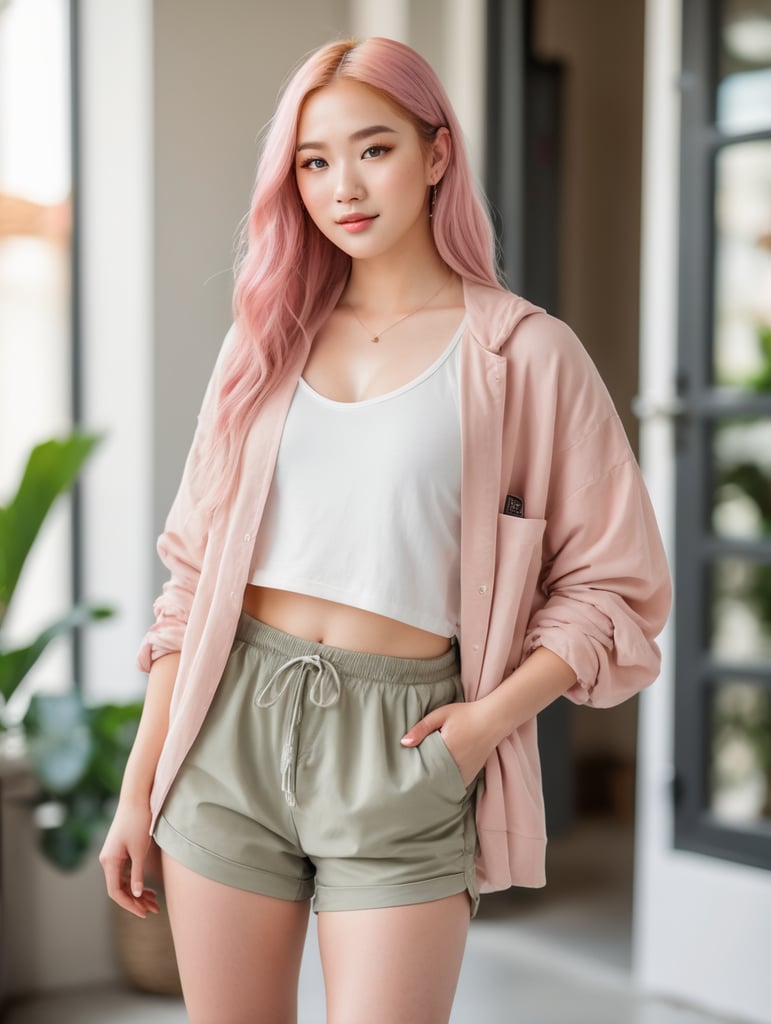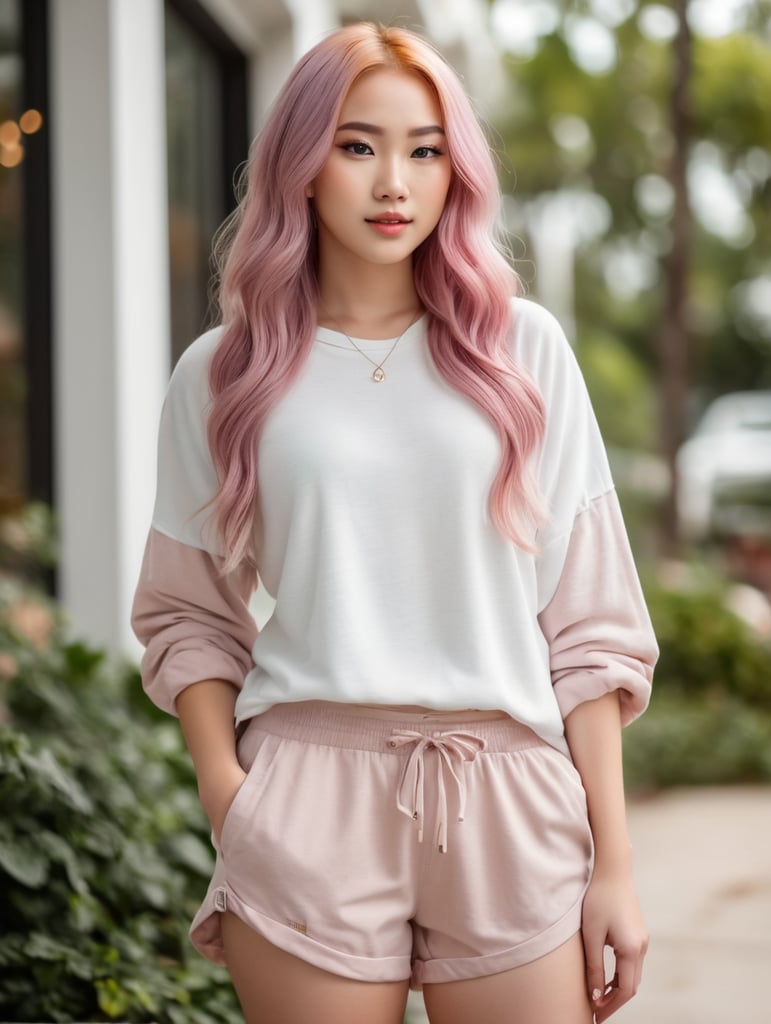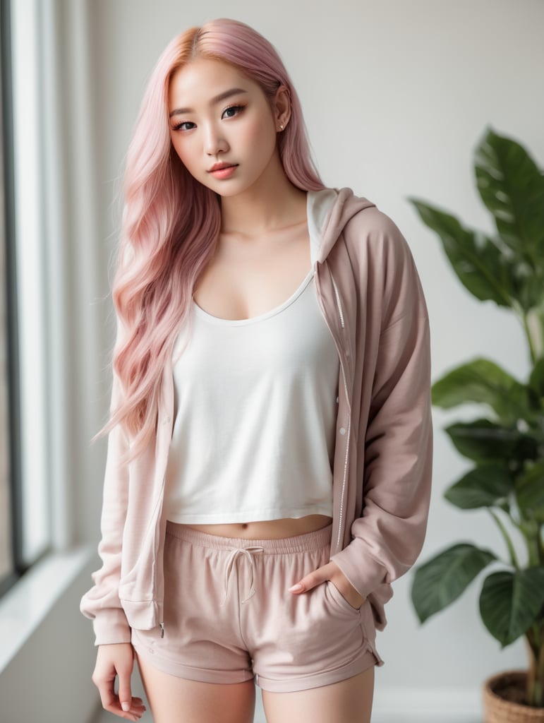 (full body portrait:1.3),dynamic pose,1girl,asian,pale skin,long pink hair,delicate face,heterochromia eyes,freckles,(oversized clothes:1.3,gym shorts:1.3),(thigh gap:1.3,thighs:1.3,one hip up:1.3,barefoot:1.3),white background,(best quality:1.2,ultra-detailed,realistic:1.37),soft colors,polished lighting