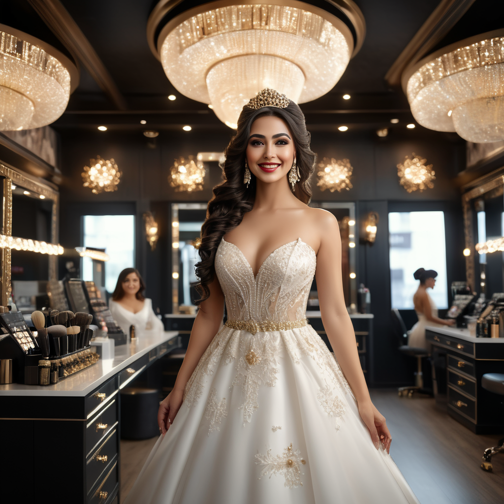 a full image wide Angle of a beautiful bride is standing happy in a modern dark hair saloon shop surrounded by the hair styler employee, 16k, the pride is wearing white elegant modest toll dress, full makeup, bokeh background, cinematic, hyper detailed, spotlights, canon photography, black wavy hair , saloon walls are black and gold accent, saloon is vast.