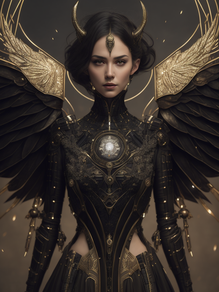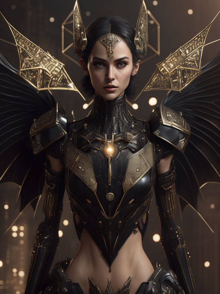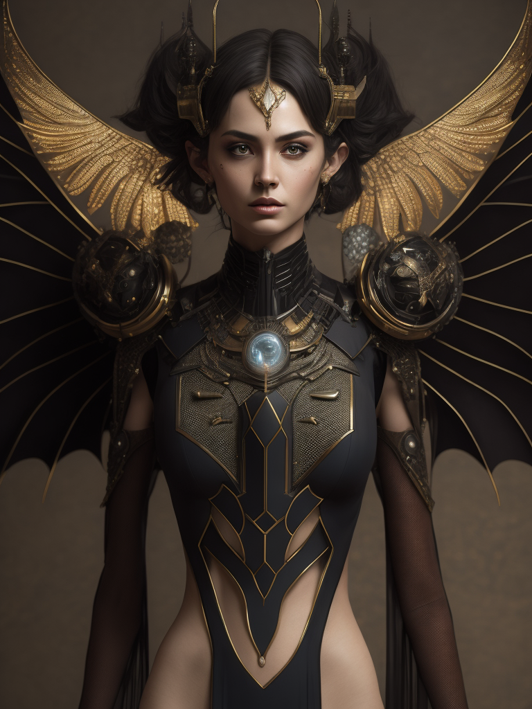 futuristic world, transparent electric robot girl with visible wires and electronics on her head, fine facial features model in georgian round black dress by roberto ferri, by jeremy lipking, realism, insect eyes, bat wings on the nape, black gothic clothing, black abstract geometric ornaments, gothic palette, 8k, medium shot, cinematic photography, abundant detail, muted tones, regency-era, empire silhouette, delicate movements, intricate diamond mosaic on her body mesmerize audiences. The story could explore themes of artificial intelligence, beauty, and the intersection of technology and arthttps://lumenor.ai/terms-of-service/https://lumenor.ai/ai-generated-images-gallery/hWqf7jqPzY/lumenor AIlumenor AI