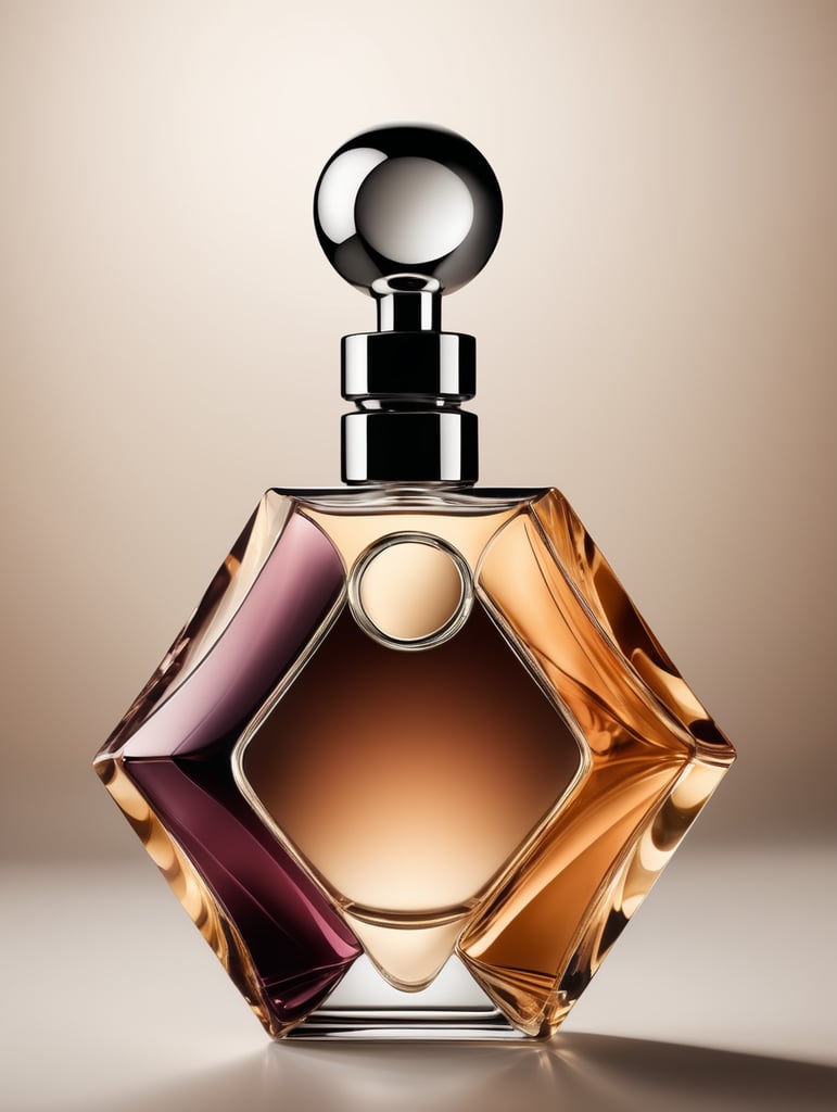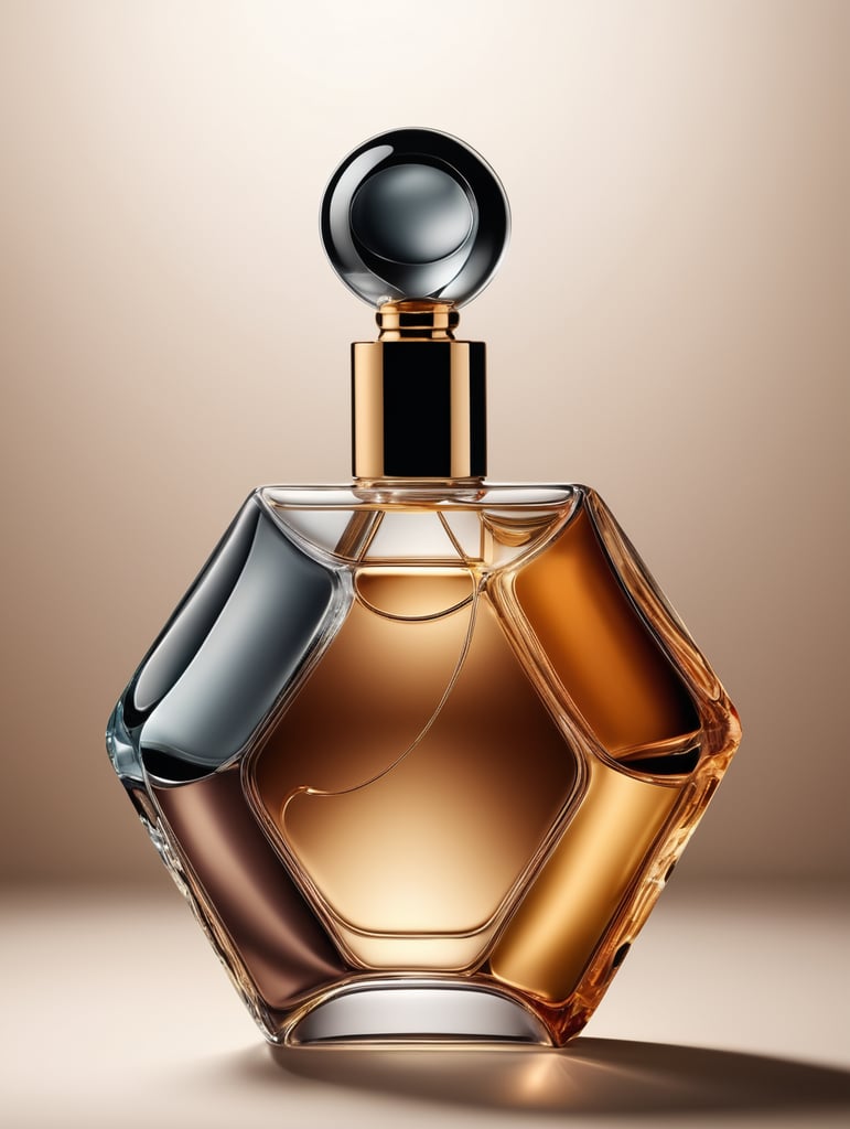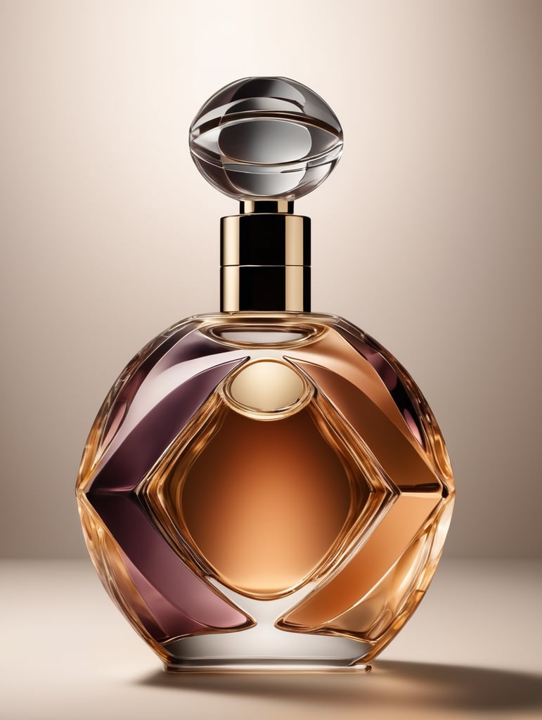 Generate an image of a perfume bottle that embodies the essence of abstract beauty, incorporates elements of exquisite showcases a unique design that captures the imagination