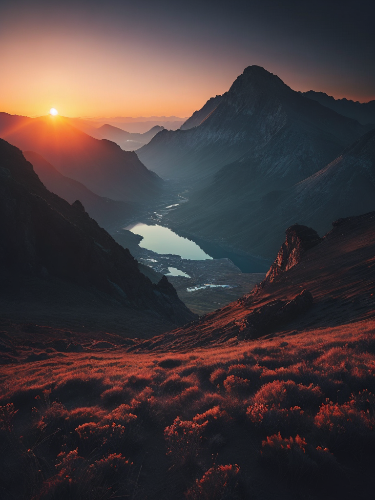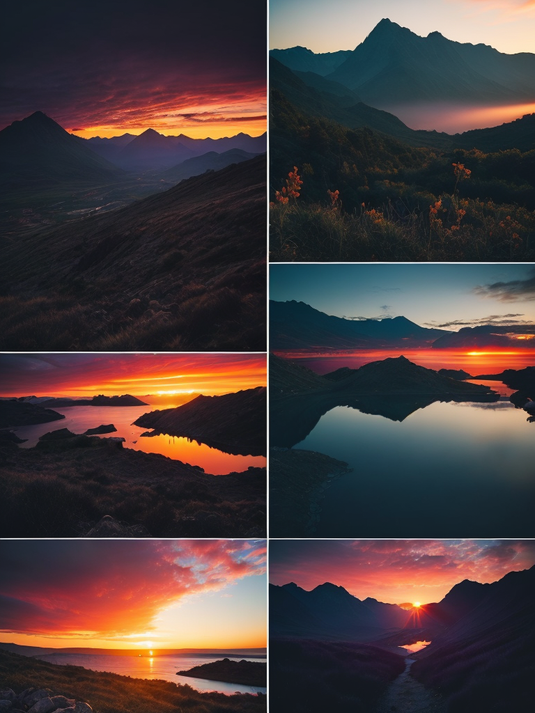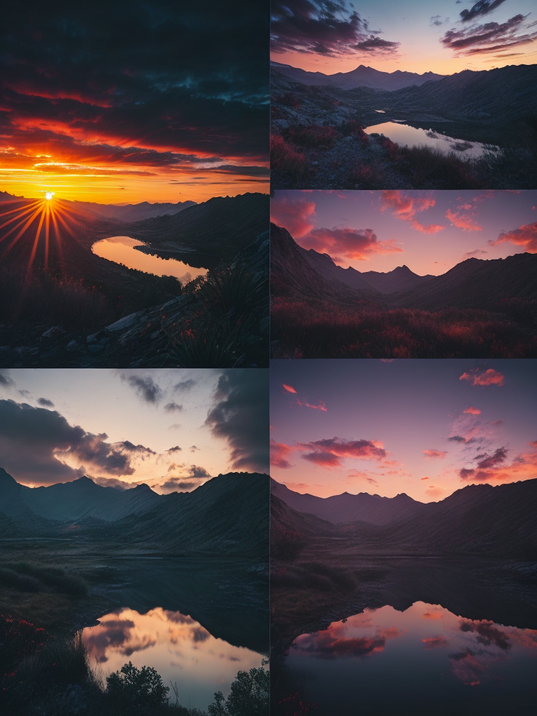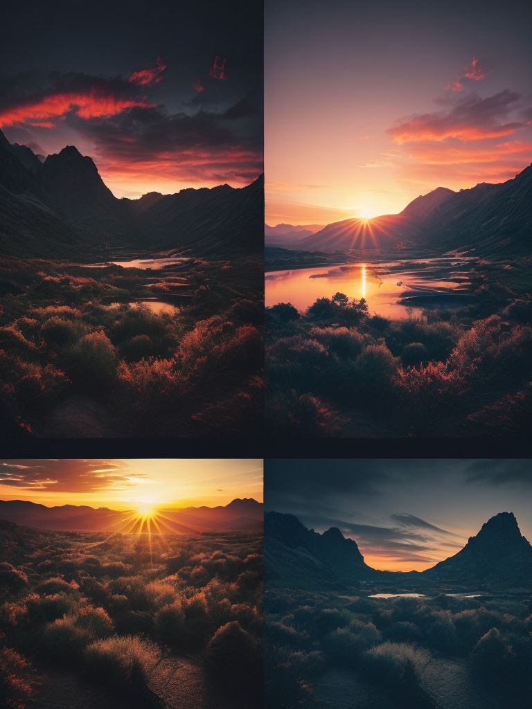 Generate a stunning landscape with vibrant colors and a breathtaking sunset