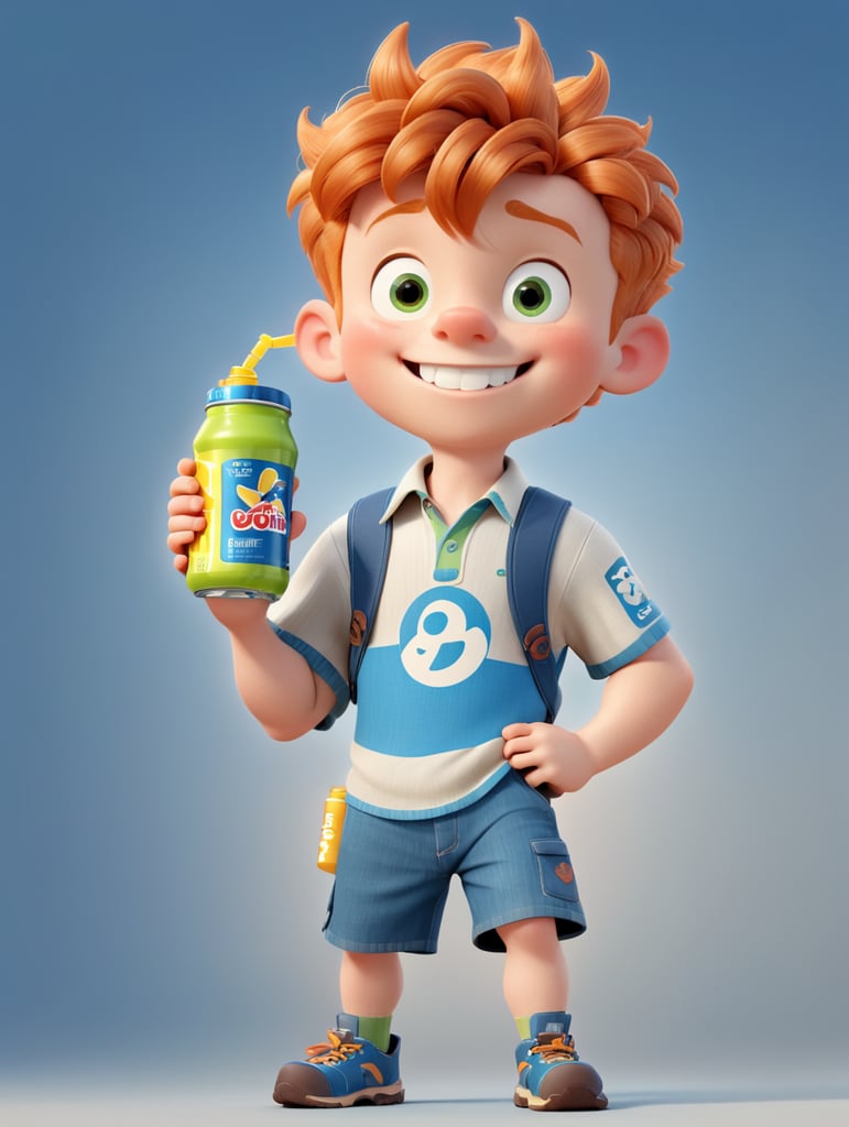 Ginger Disney / Pixar-style boy with braces drinking an energy drink. Full-body.