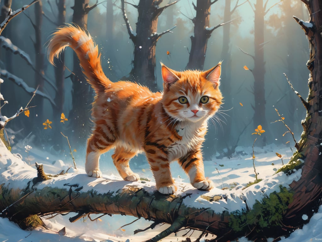 Ginger kitten walking along a tree branch in a tree covered in snow. Sunny day, viewed from the side.