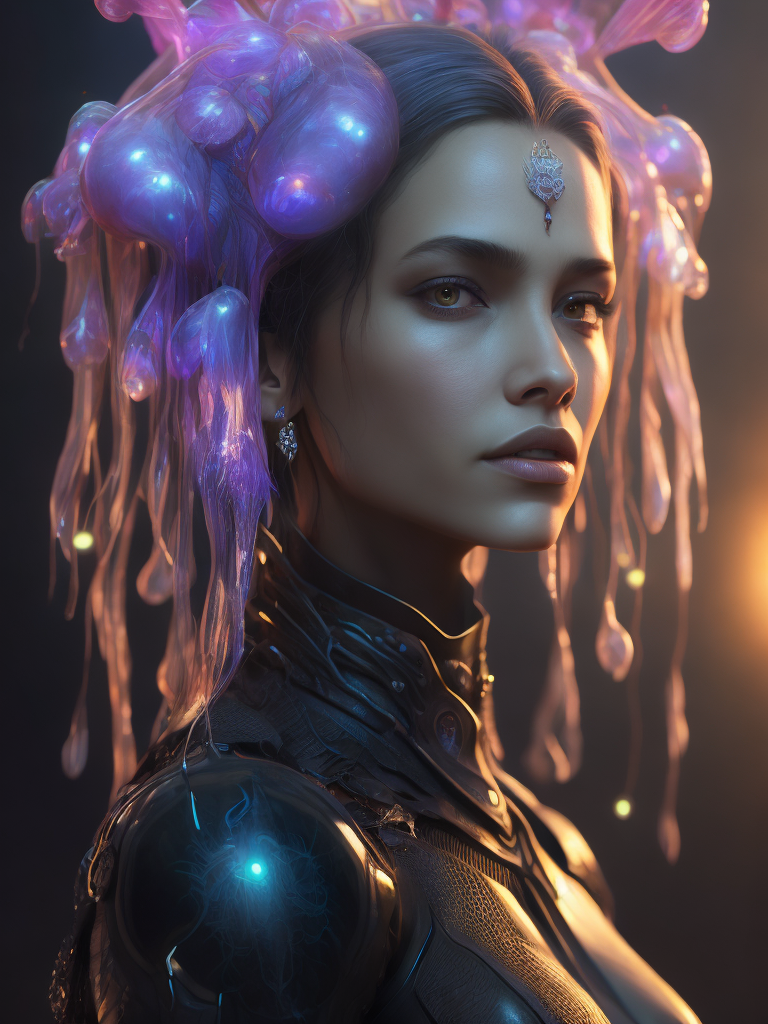 A girl have biomechanical brain, transparent, bioluminiscent creatures, 8k resolution, trending on artstation, cinematic, hyper realism, goddess close-up portrait, chimera orchid jellyfish, 3d