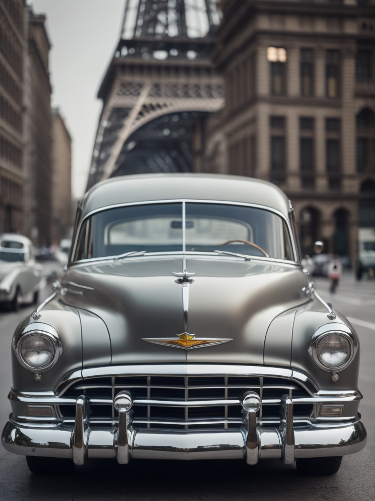 1952 Gray Chevrolet, with the Eiffel Tower in the background, surrealistic, landscape, muted tones