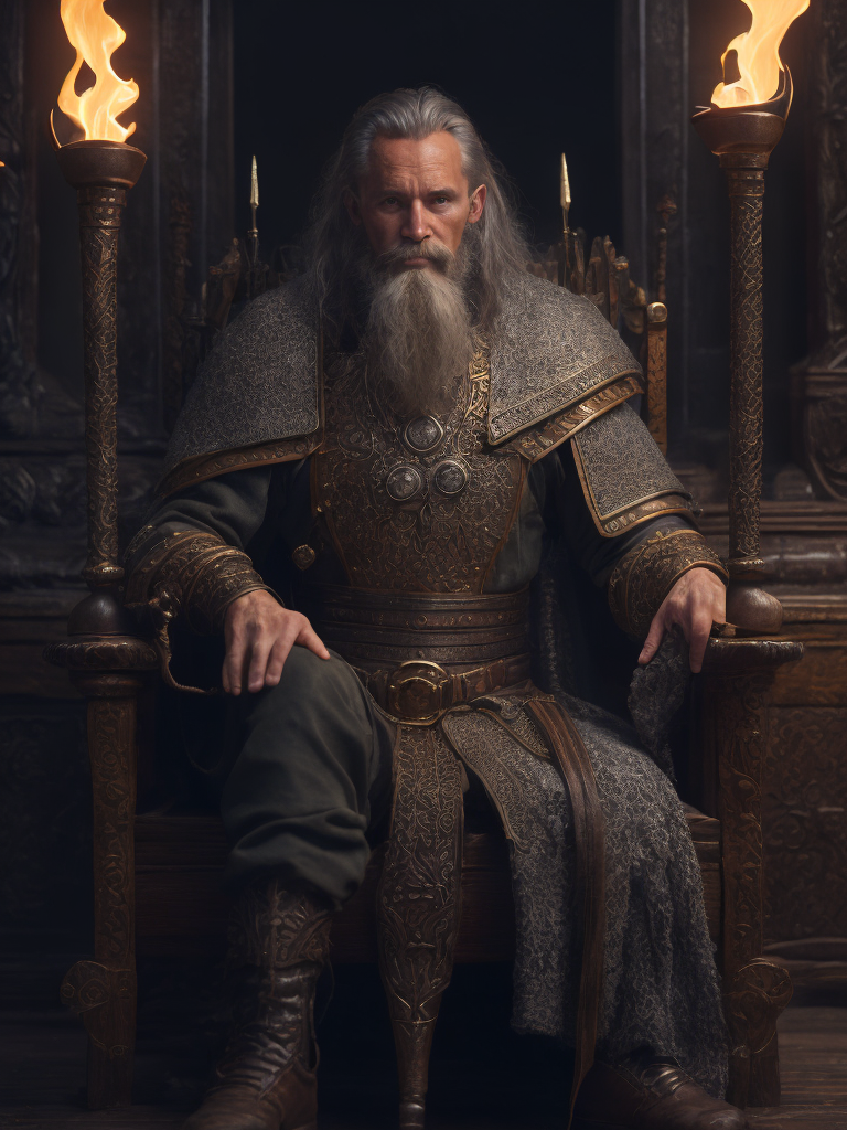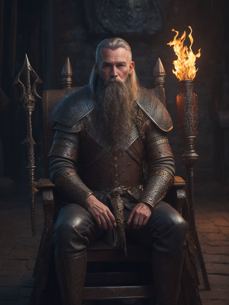 Highest quality, masterpiece, photorealistic, medium shot, RAW photo, of (a weary-looking but still proud and fierce-looking old Viking warrior, now the leader of his village, dressed in elaborately detailed chain mail and leather armour, sitting on a carved wooden throne furrowed with Viking runes and symbols, in the village meeting hall, on his lap rests an elaborately carved and beautifully crafted longsword, a few torches burn on the walls, giving the scene a dark atmosphere but sculpting the forms in sharp chiaroscuro), it is night time, (highly detailed skin), skin texture, (detailed face), detailed background, sharp focus, dark lighting, twilight lighting, volumetric lighting, highly detailed, intricate details, 8k, highly detailed, UHD, HDR