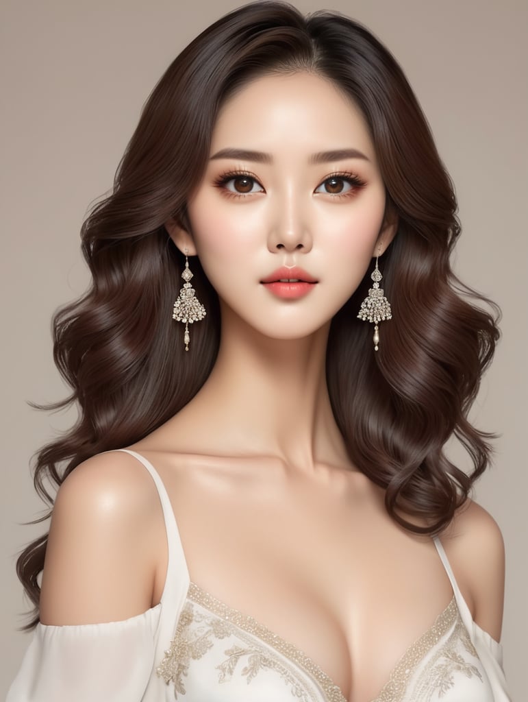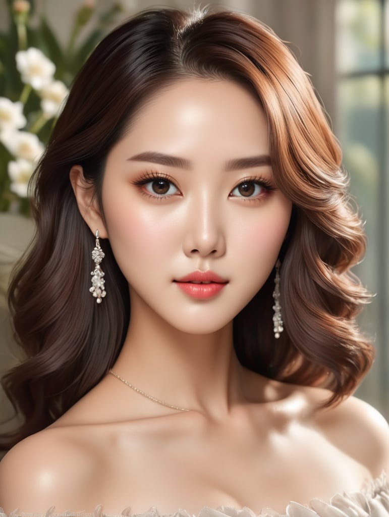 A highly detailed digital illustration of a stunningly beautiful Korean female idol with a flawless appearance. She embodies a perfect combination of cuteness, charm, and elegance while exuding a touch of sexiness. Her features are delicate and symmetrical, with large expressive eyes, a small pointed nose, and soft, naturally plump lips. She has long, flowing, and impeccably styled hair, cascading in glossy waves. She wears a stylish and modern outfit—a blend of chic sophistication and playful femininity, such as a fitted off-shoulder dress paired with delicate accessories. The background is minimalistic, subtly emphasizing her radiant presence, and the lighting softly enhances her flawless skin and enchanting aura.https://lumenor.ai/terms-of-service/https://lumenor.ai/ai-generated-images-gallery/j6jSxpLfm/lumenor AIlumenor AI