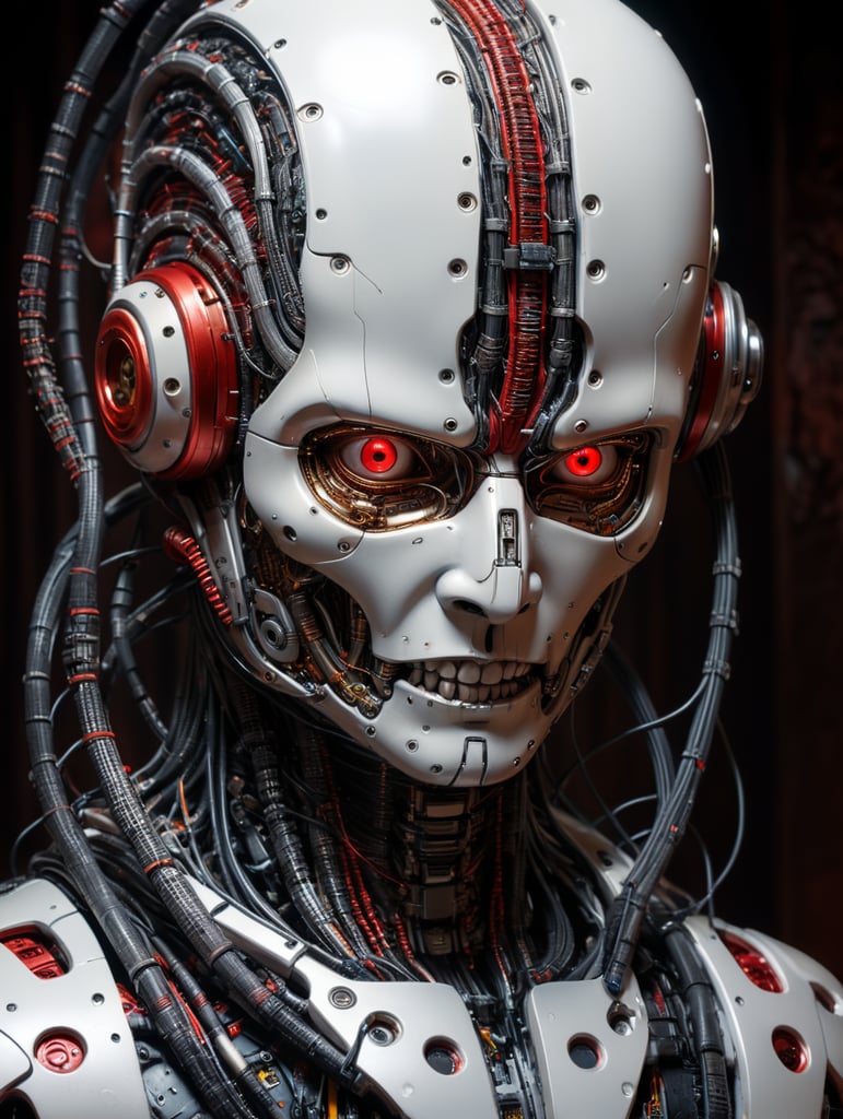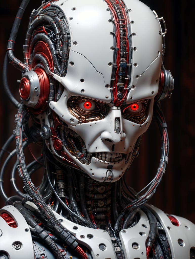 - cyborg head metal spine cables connected empty eye red glowing eye red rusty wall technology futuristic dystopian sci fi