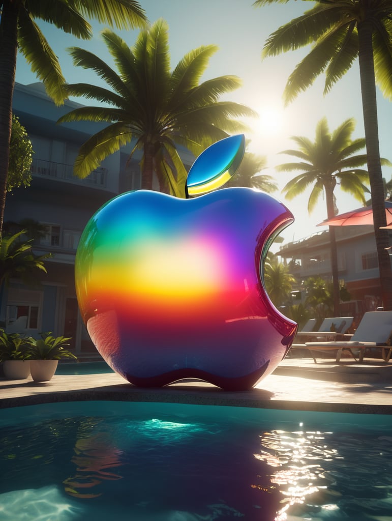 hyper realistic apple imacs as clear plastic pool float with sunlight shining through, neon palette, miami beach, unreal engine, octane render, cinematic lighting, highly detailed miami beach, y2k, bright colors, hyperrealistic, low angle, 16k, 8K UHD, 8K texture, cinematic, rim lighting, neon palette, color theory, dramatic, volumetric lighting, 35 mm, in focus, unreal engine, highly detailed, octane render, ultra high resolution