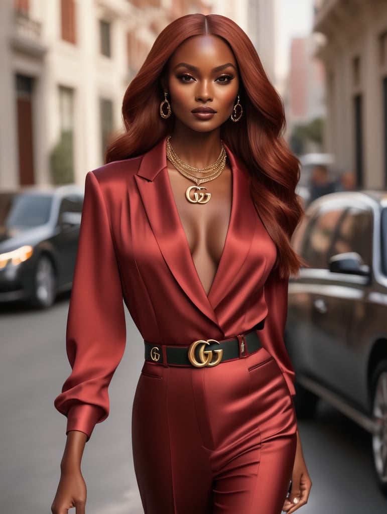 Hyper realistic, beautiful sophisticated, effortless dark skinned, female full glam, silky, straight red hair Down to hips, luxurious, elegant Gucci outfit