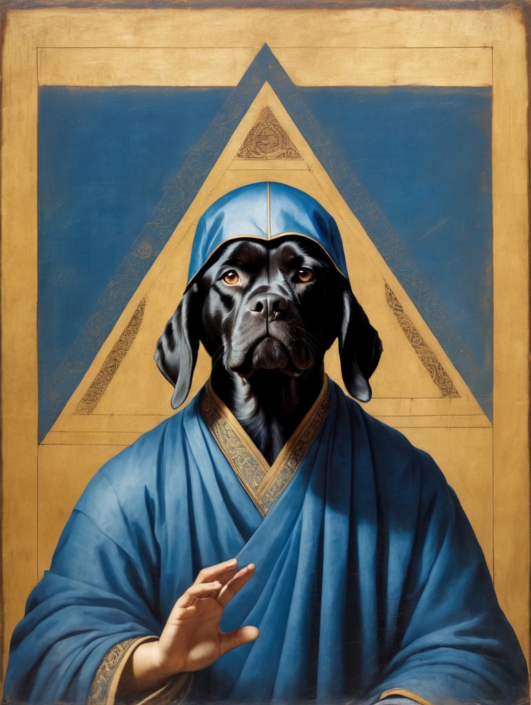 icon painted by Leonardo Davinci, portrait of a human with a black angry dog's head, clothes in a blue coverlet, hand crossing fingers, glow around the head in the form of a triangle