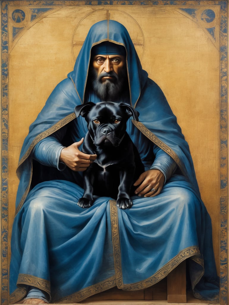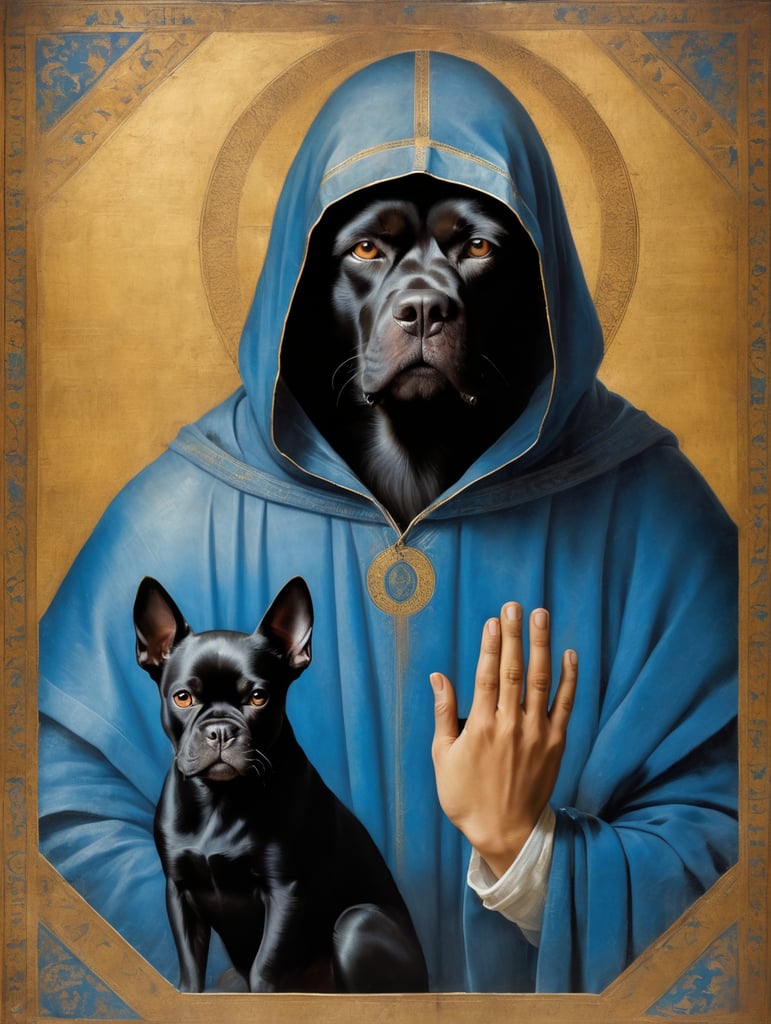icon painted by Leonardo Davinci, portrait of a human with a black angry dog's head, clothes in a blue coverlet, hand crossing fingers, glow around the head in the form of a trianglehttps://lumenor.ai/terms-of-service/https://lumenor.ai/ai-generated-images-gallery/hp08S0Fmnn/lumenor AIlumenor AI