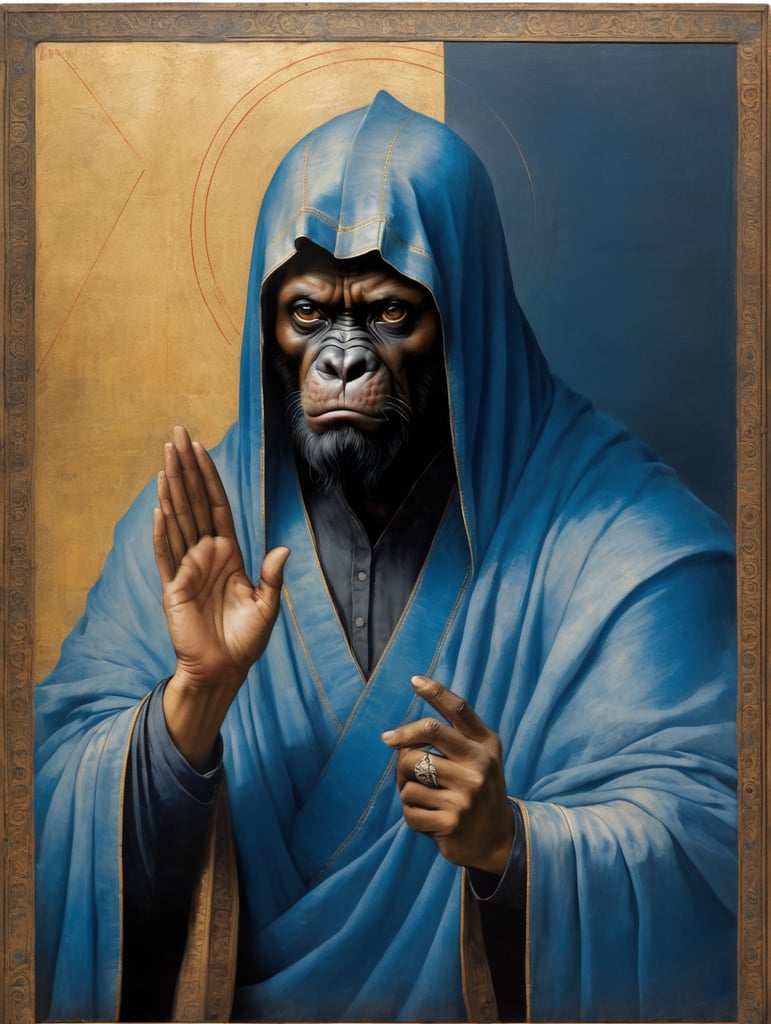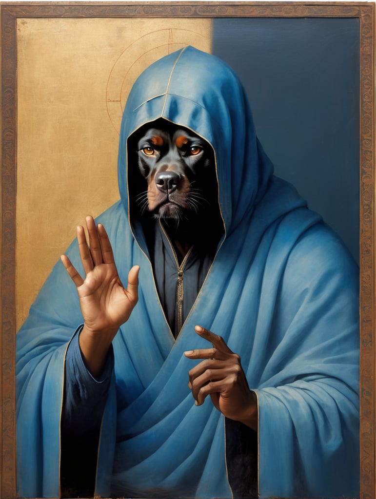 icon painted by Leonardo Davinci, portrait of a human with a black angry dog's head, clothes in a blue coverlet, hand crossing fingers, glow around the head in the form of a trianglehttps://lumenor.ai/terms-of-service/https://lumenor.ai/ai-generated-images-gallery/hp0I4NCJgf/lumenor AIlumenor AI