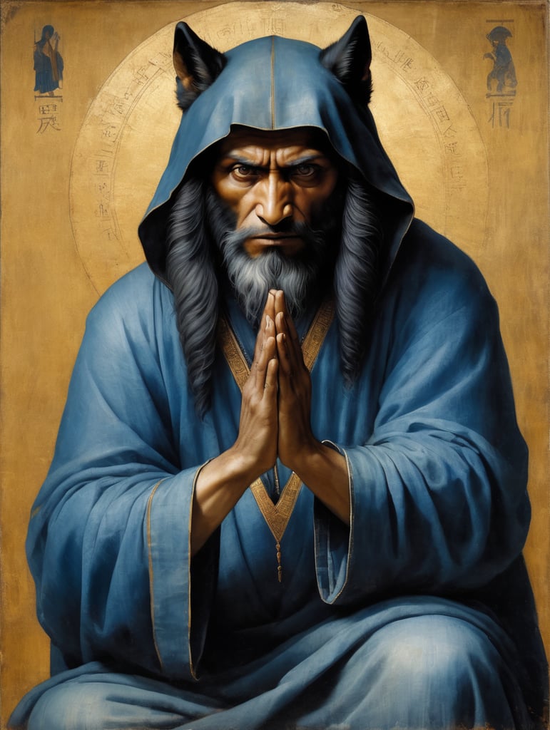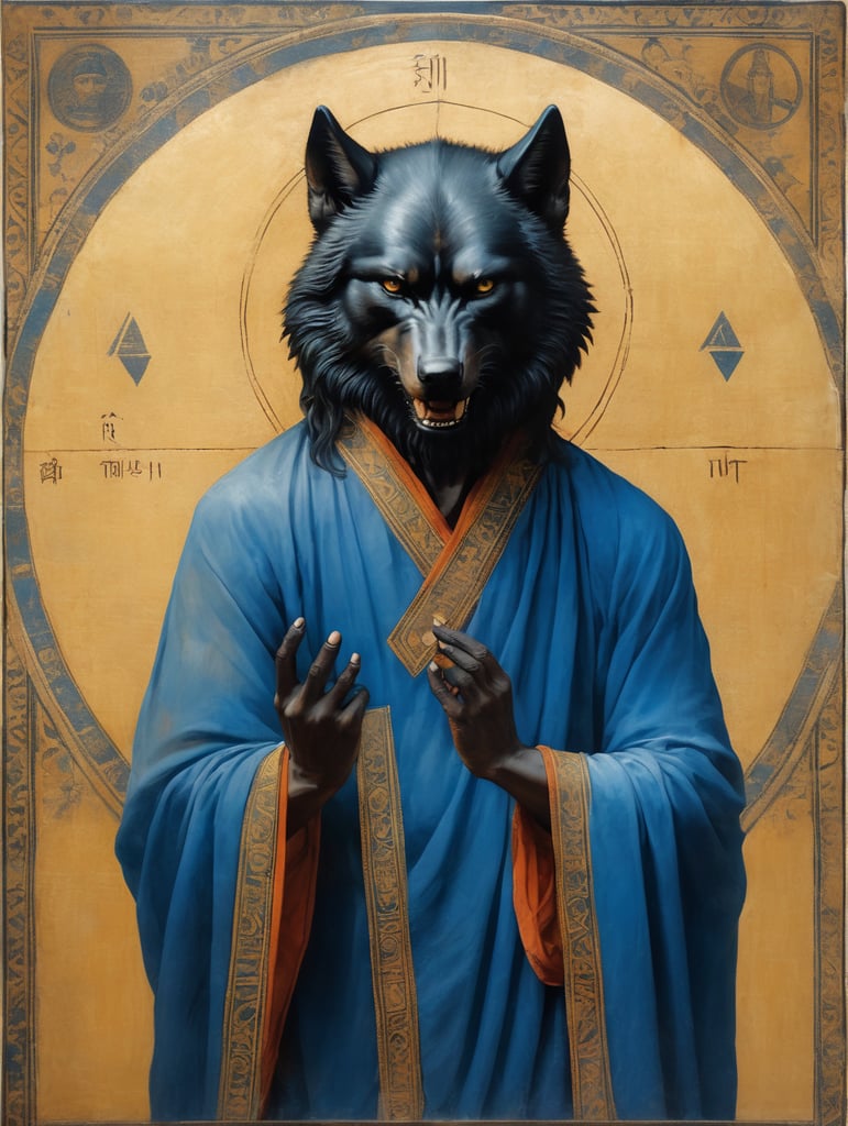 icon painted by Leonardo Davinci, portrait of a human with a black angry Wolf head, clothes in a blue coverlet, hand crossing fingers, glow around the head in the form of a trianglehttps://lumenor.ai/terms-of-service/https://lumenor.ai/ai-generated-images-gallery/hp0TTIfhC0/lumenor AIlumenor AI