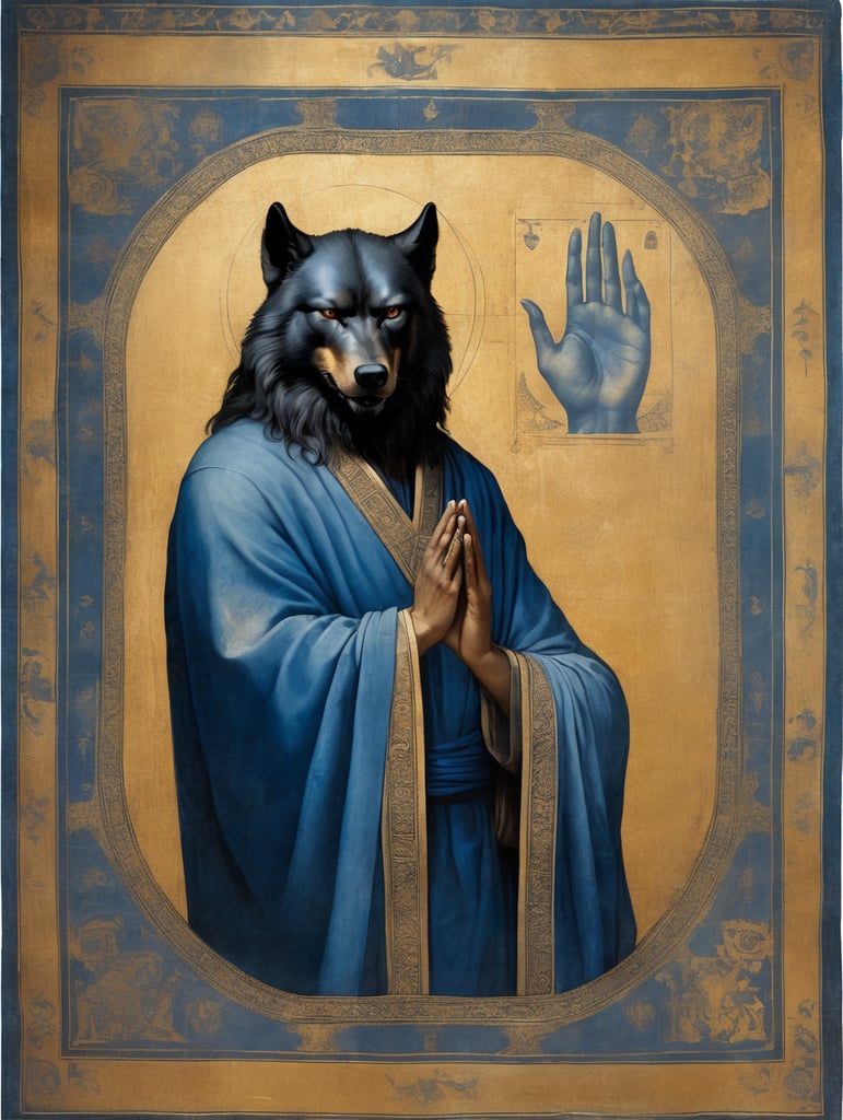 icon painted by Leonardo Davinci, portrait of a human with a black angry Wolf head, clothes in a blue coverlet, hand crossing fingers, glow around the head in the form of a triangle