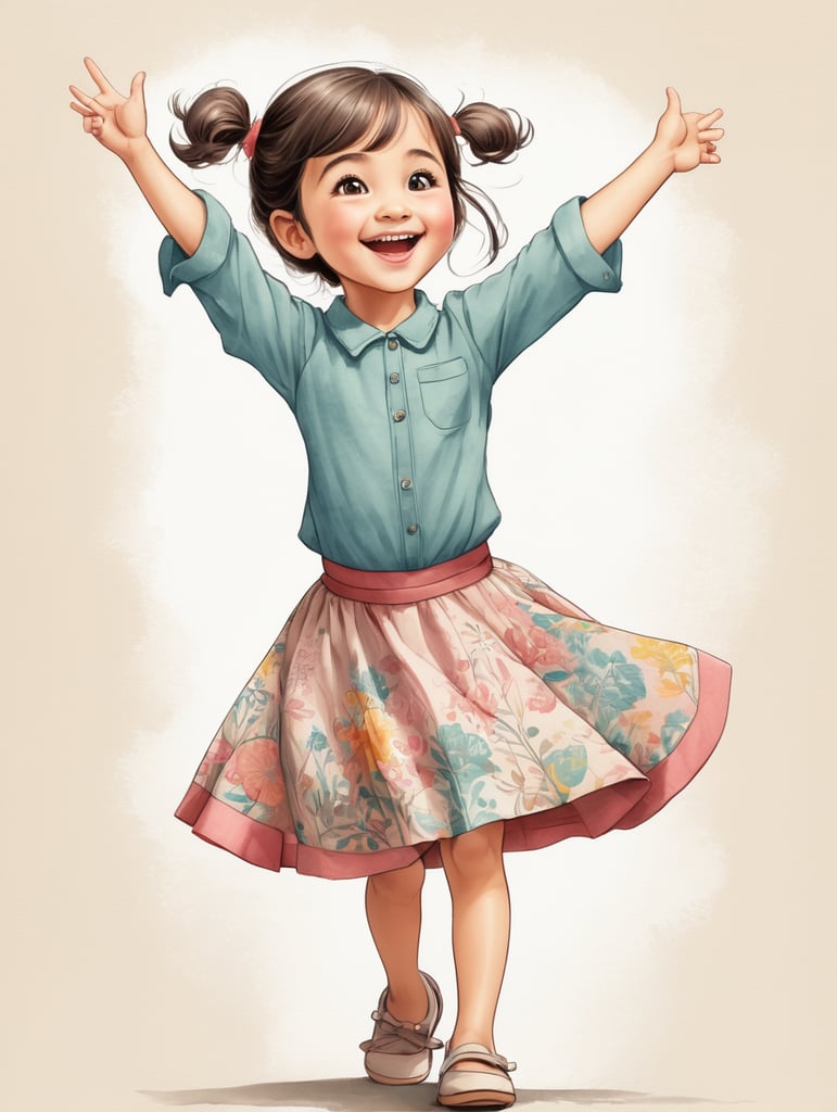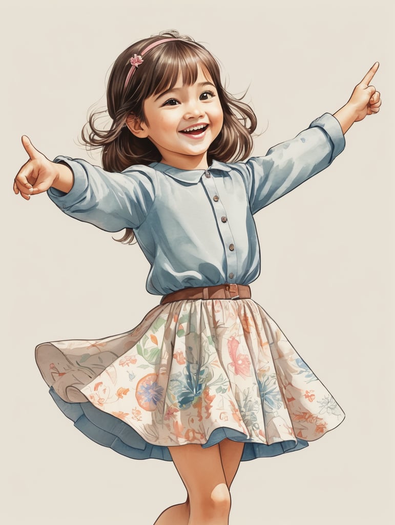 Illustrate the joyous image of a charming young girl seen from behind, happily reaching forward with her hand pointing to the right. The depiction is in an adorable ink sketch style, adorned with cheerful colors. The illustration portrays the full body of a nine-year-old girl with her hands raised on the right side. She is dressed in a skirt and a long-sleeved shirt, enhancing the overall cuteness of the artwork.https://lumenor.ai/terms-of-service/https://lumenor.ai/ai-generated-images-gallery/gN0qM9U6u/lumenor AIlumenor AI