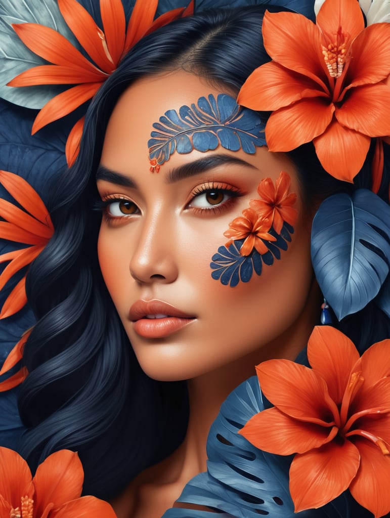 Illustration collage portrait closeup beautiful Polynesian model, models facial features are all in dark blue, three colour tone illustration using dark blue, orange and red, artwork, decorative floral artwork nature inspired collage textured vector shapes of tropical flowers, realistic illustration style, finely detailed, soft tones,