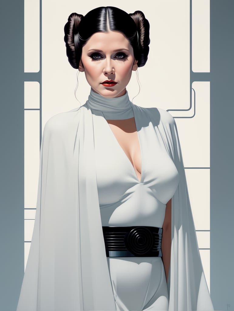 Illustration. Manga. Patrick Nagel. High Contrast. Flowing line. Shadow. Youthful Carrie Fisher as Princess Leia. Star Wars. Surreal minimalism. Pin up.